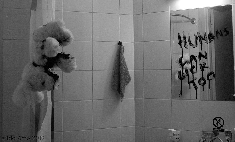 Now this one is my favorite. A young girl who usually has a hard time sleeping, drapes her hand over the bed where her dog is lying. It would lick her hand where she then relaxes and falls asleep. One night, she keeps waking up with the sound of dripping coming from somewhere. She checked downstairs on the faucet but saw nothing. She then checked the bathroom, where she was met with a gruesome sight. Her dog was mutilated and draped on the wall, creating the dripping sound with it's blood falling on a small pool. On the mirror she sees two things. The first is a sentence written in blood "Humans can lick too." She also sees a dark figure standing behind her. (And yes that is just a stuffed animal in the picture above. I promise)