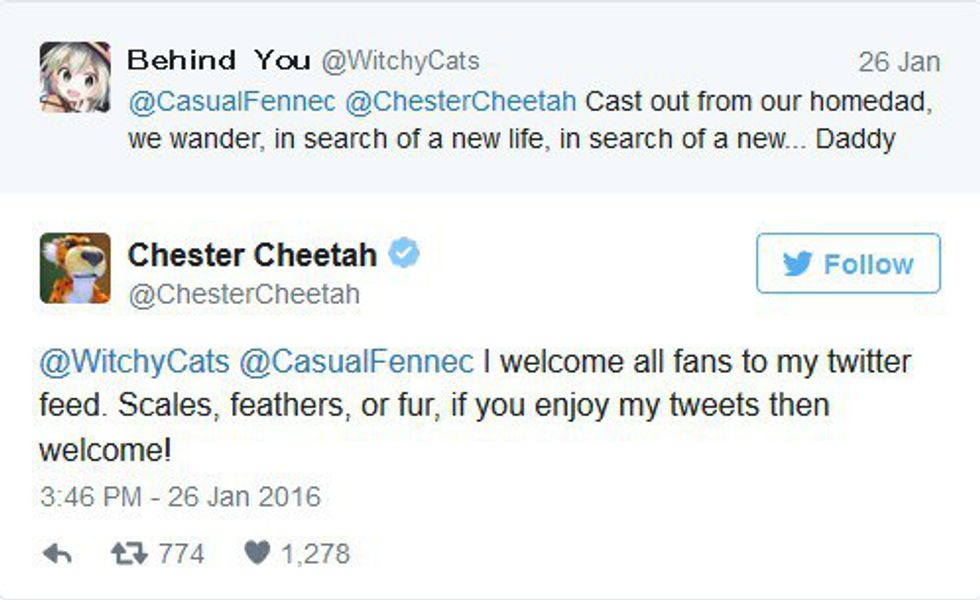 To be brief, Furries are a loose-knit community of people who enjoy wearing animal costumes and/or taking on animal personalities, known as "fursonas." While not inherently sexual, a sizable amount of the community online are more prominent, as tumblr and DeviantArt users are well aware. Whereas Tony the Tiger cast them out, though, Chester Cheetah is welcoming them with open arms.