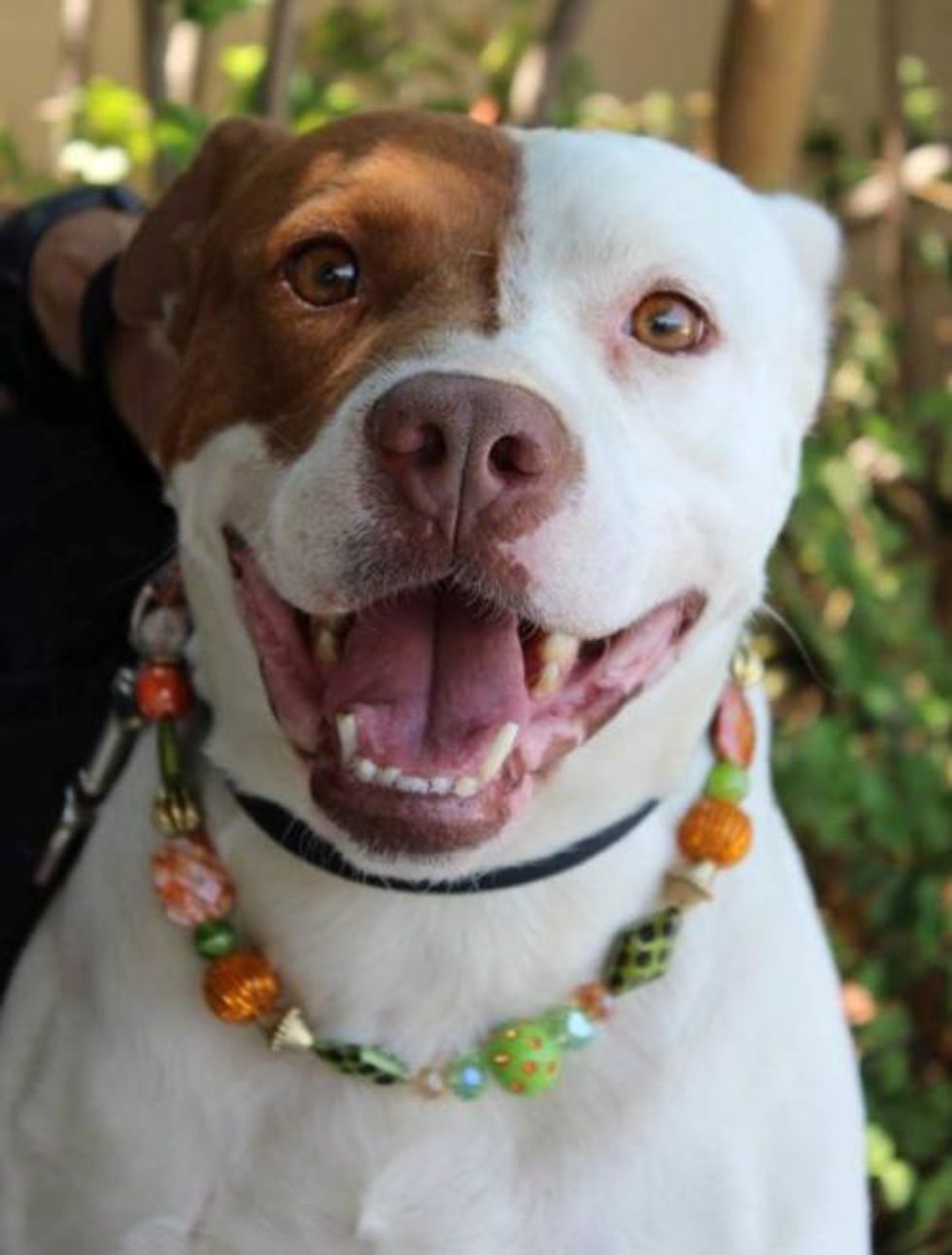 A two-year-old Pit Bull Terrier mix who is looking for a stable family. She's available at Last Chance Animal Rescue.