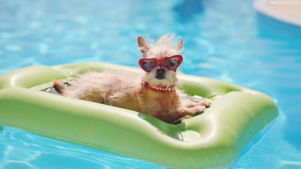 It's not a rager, we'll admit that. This dog has the frazzled hair-puff of someone who has to make conversation with relatives for a week, but look how pampered he is. The sparkly collar, the pristine pool, and that gleaming floatie -- vacation with your parents means a vacation someone else is paying for. Bonus: sunglasses, so you can check out the other beach-goers without your parents noticing. (Source)