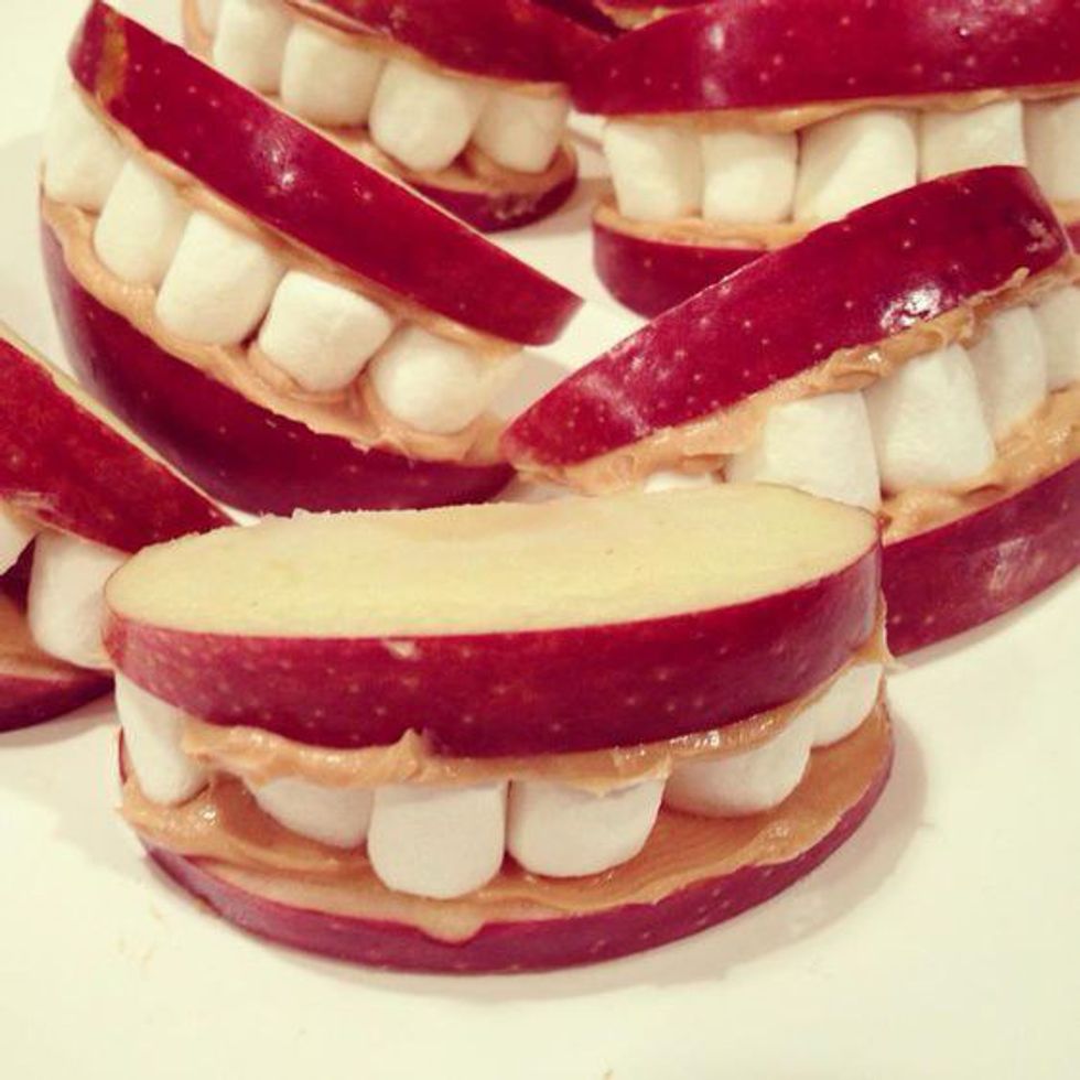 I’m a sucker for a good pun (hehehe) but this is adorable. Cut apples into slices, smear some peanut butter on each, and smush some marshmallows or peanuts in between two slices for a spooky mouth. Check it out here.