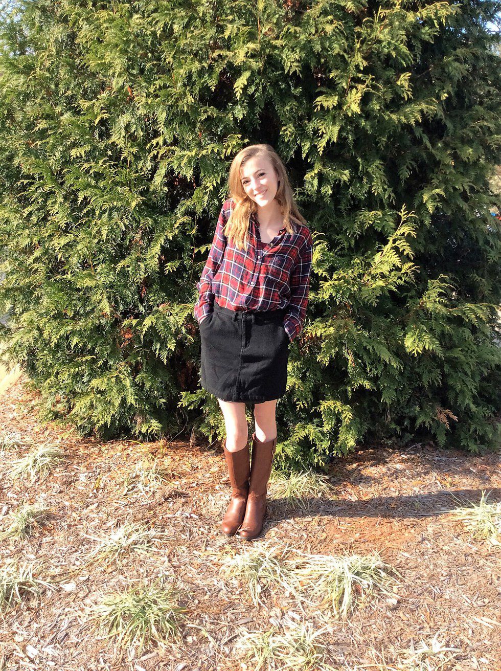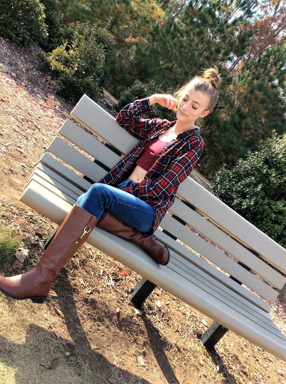 This look is a classic fall outfit with a twist. Rock your traditional, cozy jeans, flannel, and your fave pair of fall footwear (in Sam's case it's her beloved riding boots), and spice it up with a fun crop top (or a tank top for the more conservative dresser). This look is great for a day of hanging with the fam or doing a little Christmas shopping, and is super easy and fun.