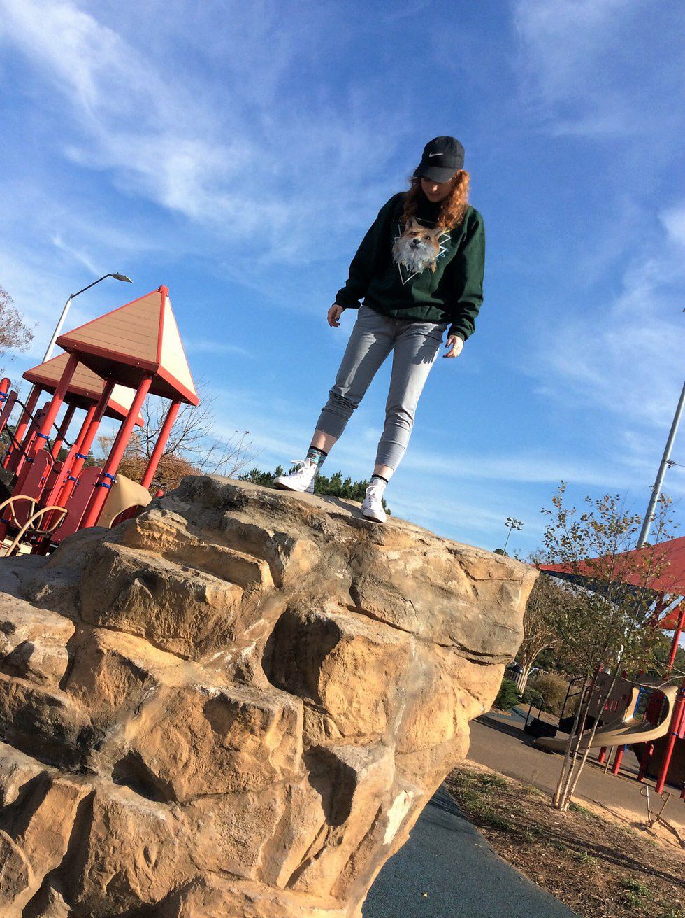 Lovingly entitled the "Yeezy Look" (mostly because of my incredibly extra pose), this outfit is cozy, comfy, and still super cool and trendy. Throw on your fave pair of kicks with the base sweatshirt, joggers, and baseball hat, and you'll be ready to take on the day- or the studio. Because you look like a cool rapper person. Or something like that.