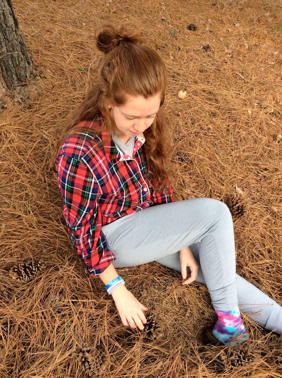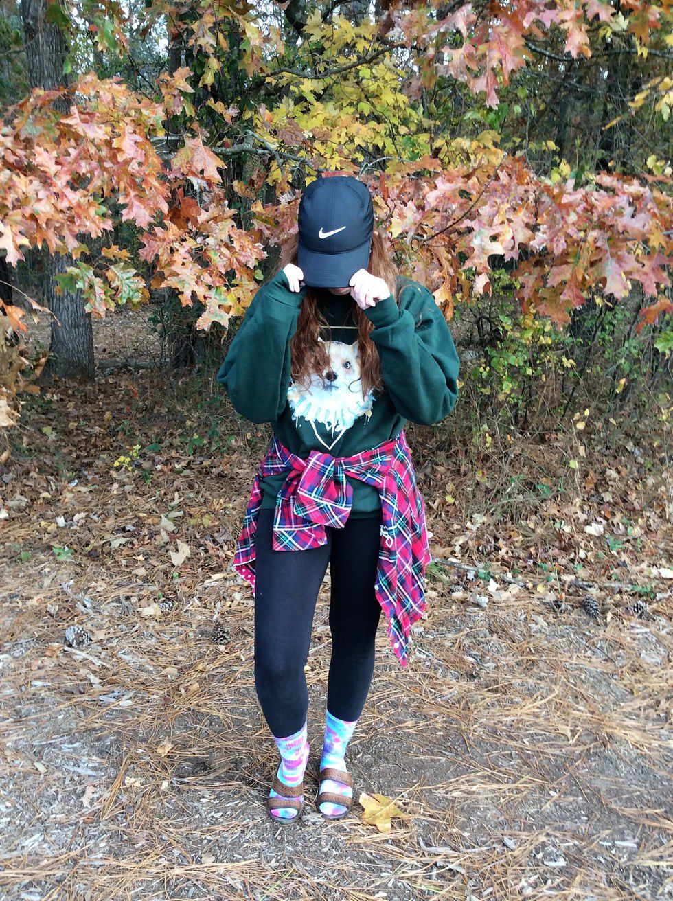 This outfit incorporates four base pieces, the most of any outfit. Casual, cute, and comfy, this look can be accessorized to fit any type of style (like Mallory's awesome tie-dye socks and Jesus sandals), and is a go to college look.