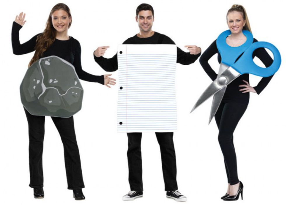 Don't quite have a big squad? Here is a small costume idea with just as much shock value! The timeless dispute solver of rock, paper, scissors. The opportunity for jokes are endless; these costumes are sure to get you lots of laughs!