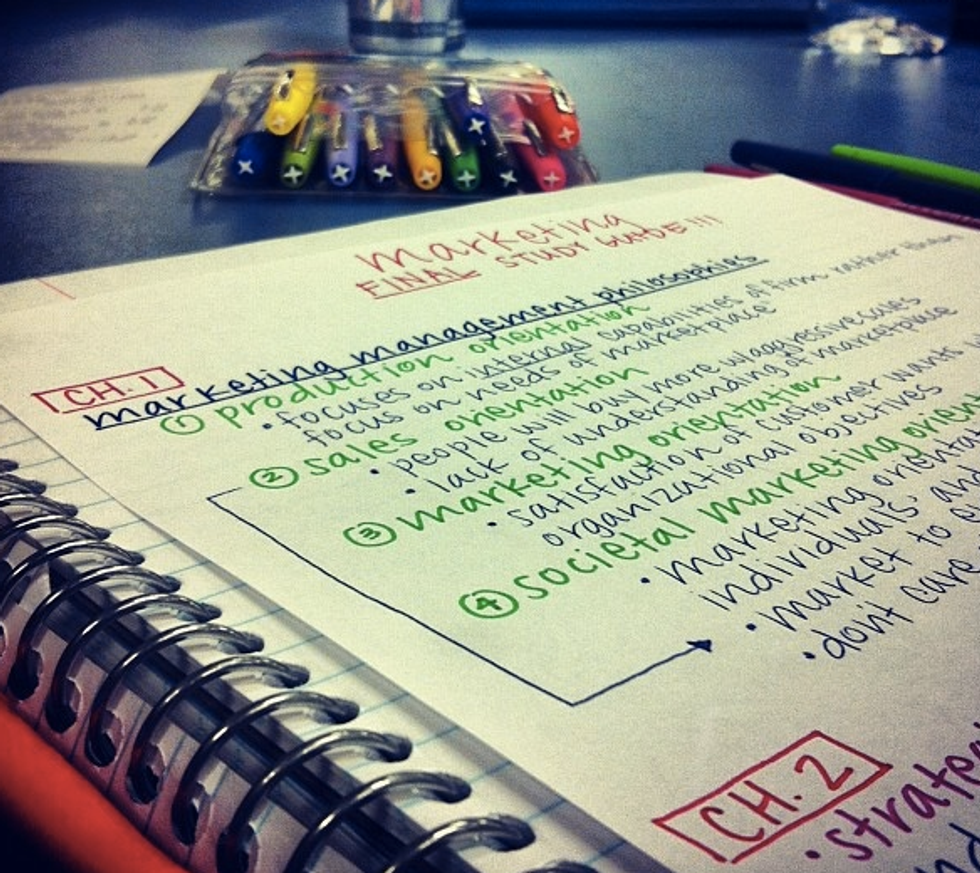 This one is a given. Keep your class notes clean and easy to read. How are you going to study and go over terms/ideas if you can't even read your own writing? Color code important terms. I personally enjoy using colorful pens which look pretty but also serve a purpose of keeping things in order. Use orange for vocabulary, purple for places or events, green for chapter overview, etc. Having a color coding system or even just keeping your notes legible, helps you retain the information as you write it and follow it when you need to study it. When studying, rewrite your notes -- the more you do this, the more you'll remember each time and eventually you will be able to rewrite your notes without looking at the original paper.