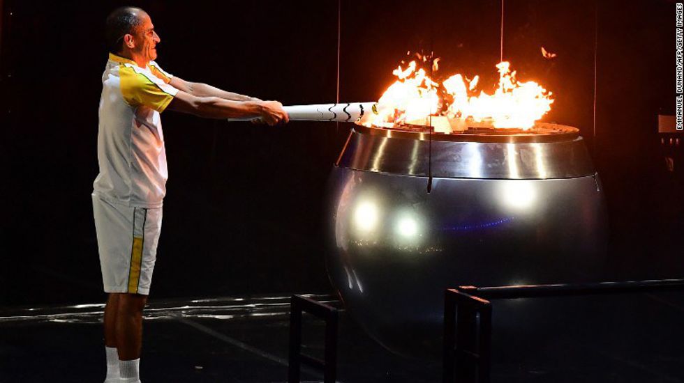 Three time champion of the French Open, Gustavo Kuerten entered the stadium with a lit torch. He then handed the torch to Hortencia Marcari, a female basketball player. But, it wasn’t over yet. She passed the torch to Vanderlei de Lima, a marathon runner.