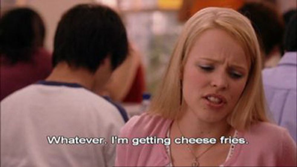 We live in a society that idolizes an ideal body. Well, if Regina George can eat cheese fries, so can I. If eating it makes you happy, go for it. Just because someone is supper skinny, doesn't mean they don't indulge in a nice basket of cheese fries now and again. Always remember the wise words Cady Heron once said, "Calling somebody else fat won't make you any skinnier."