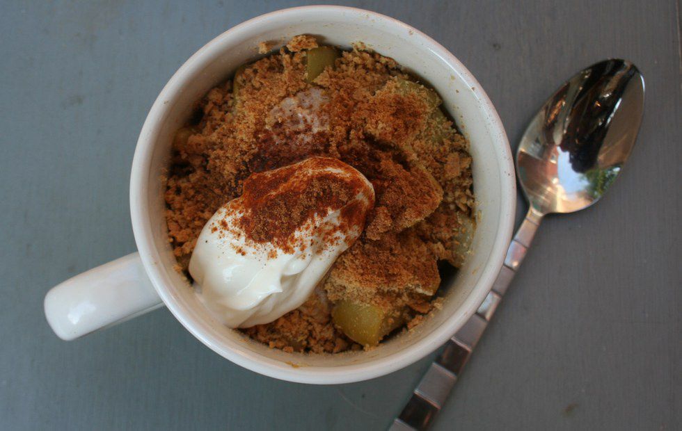 Put sugar and cinnamon on your diced apples and put it in a to-go cup. Cook it for 2 to 3 minutes and top it with some granola. Your pie is ready to go!