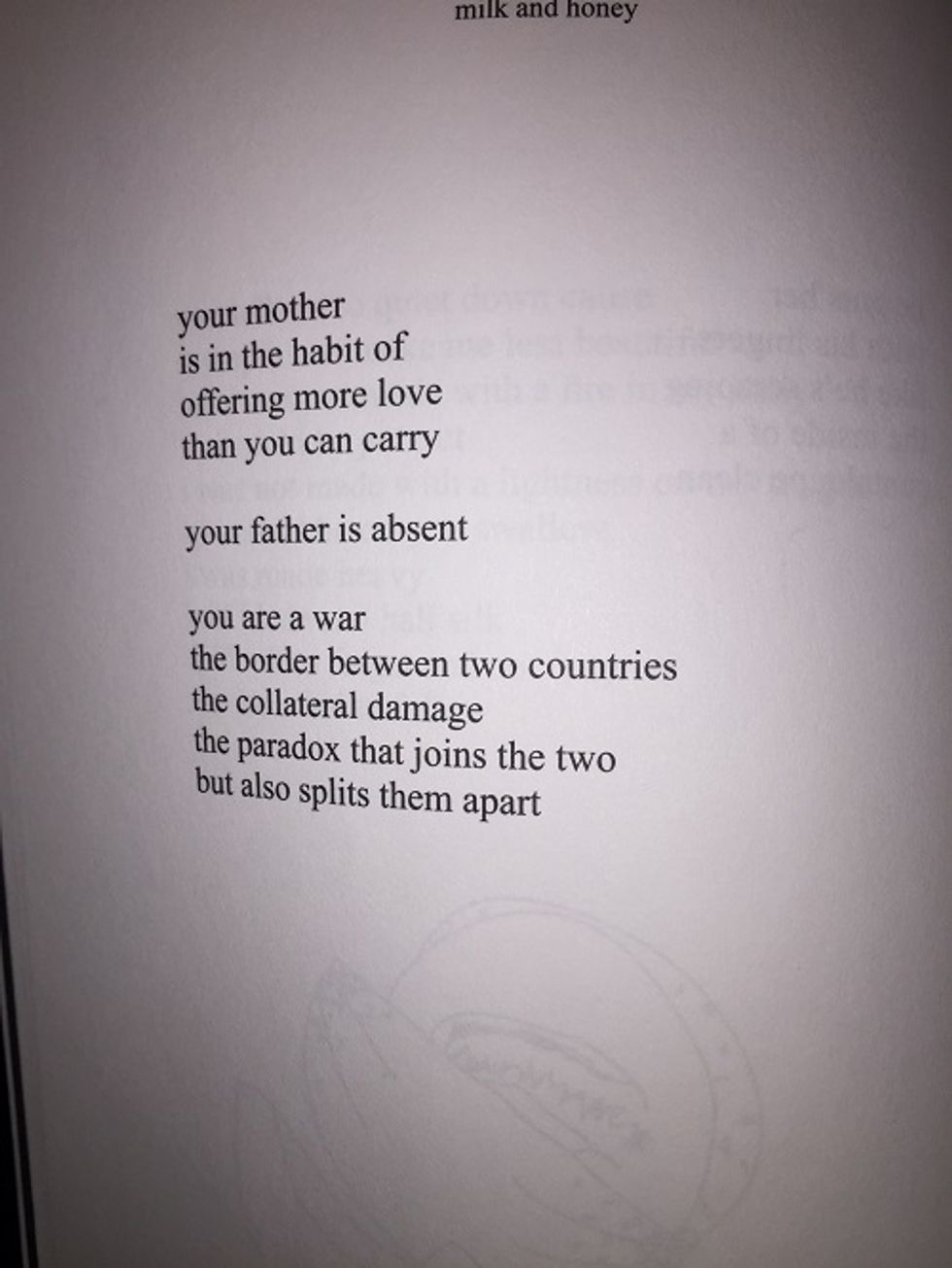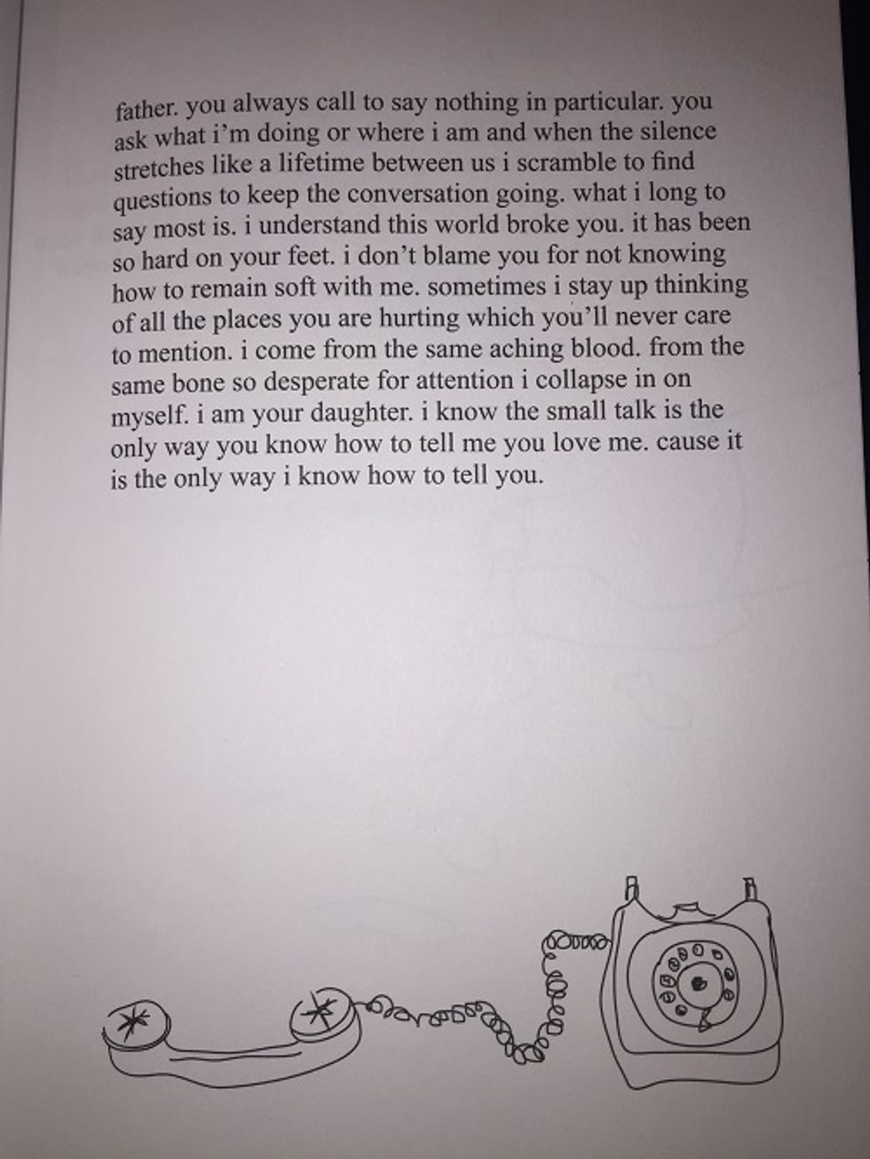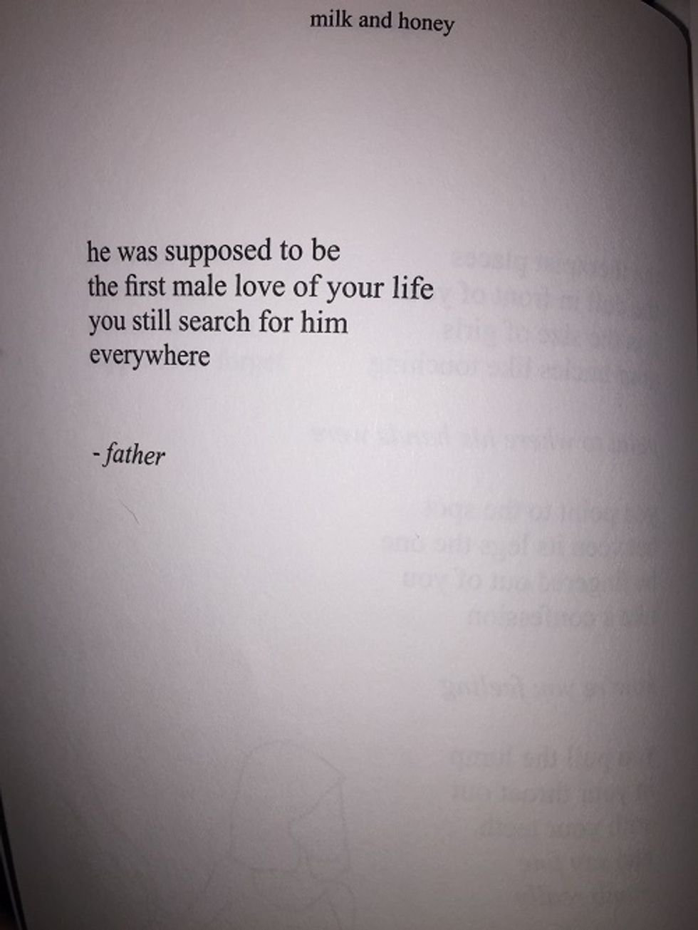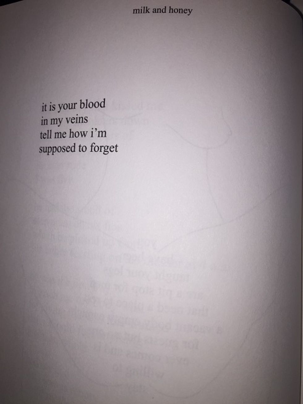 The longer I sat and read "milk and honey," the more I noticed how much I resonated with Rupi Kaur's pain. Rupi describes this book as the " journey of surviving... this is the blood sweat and tears of twenty-one years. This is my heart in your hands, this is the hurting, the loving, the breaking, the healing." These eight quotes about her father, when I read them, they turned into quotes about my father and how the hurting and the breaking is a very real thing. Thank you Rupi, for making something that feels so isolating, a little less.