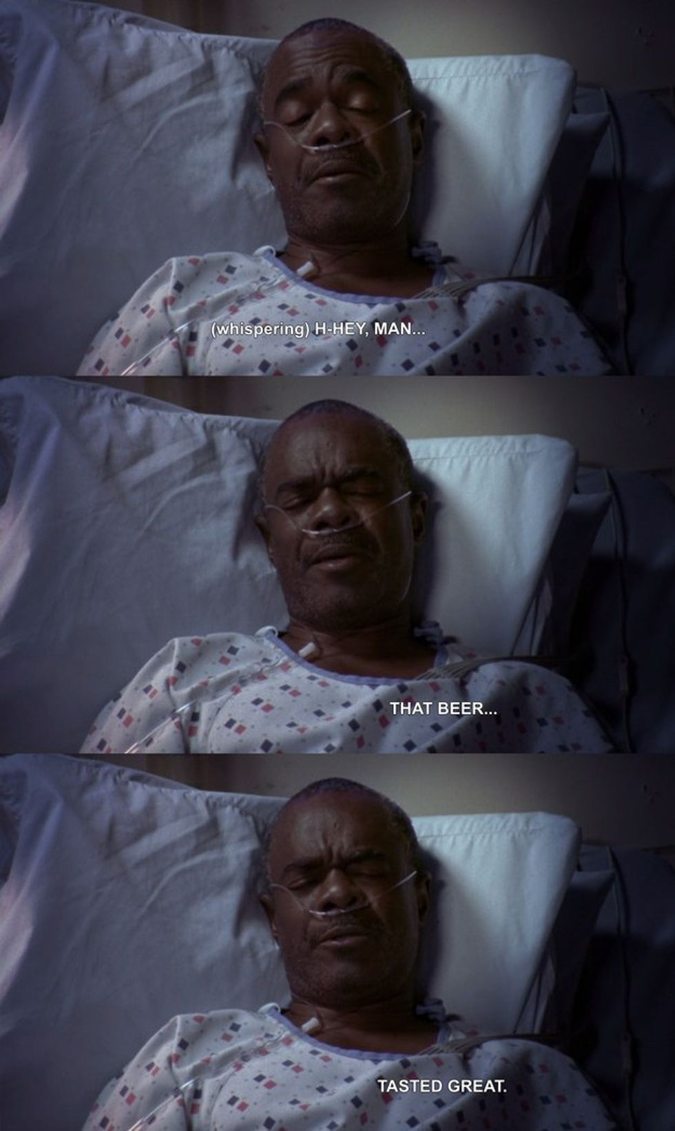 This episode (like all of them really) was packed with humor, including the talents of Aziz Ansari. Turk and JD give up their much anticipated “Steak Night” to stay with a dying patient. This episode is packed with both humorous and poignant views of death and heaven. Including JD’s hope that his last thought is a good one. None of it, however, sinks in harder than when George is passing and says “That beer tasted great”.