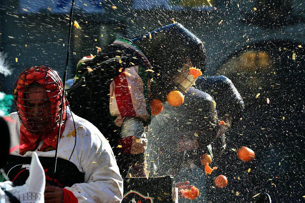 Categorized as the largest food fight in Italy, the Battle of the Oranges sounds just like what it actually is. Although the original origin remains unclear, a popular belief is that the festival celebrates the city's defiance against the city's tyrant. Of course, citizens could not battle it out with swords and stones, so why not go for one of the most acidic fruits to throw at peoples faces? As the picture is shown below, it's no wonder that they have to wear helmets and masks - oranges can surprisingly do a lot of damage (bloody noses, bruised eyes, etc.).