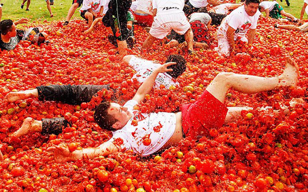 Each year, on the last Wednesday of August, a massive tomato food fight takes place in Spain. People from all countries are able to buy tickets to participate in the "World's Biggest Food Fight," a one day event. The tickets, however, are limited and only 20,000 people are able to attend. The actual food fight only lasts an hour, but cleanup lasts forever. Storekeepers cover their storefronts with plastic tarp and participants go to a nearby river in order to wash themselves afterwards.
