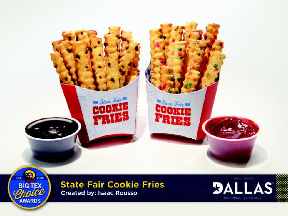 Winner of this year's most creative award, the State Fair Cookie Fries are created by Isaac Rousso, who is known for creating award-winning dishes such as the fried Cuban roll and smoky bacon margarita. These cookie fries are just what they sound like, cookies shaped like crinkle-cut fries and deep fried. They are available in chocolate chip or sprinkles, served with strawberry or chocolate sauce.