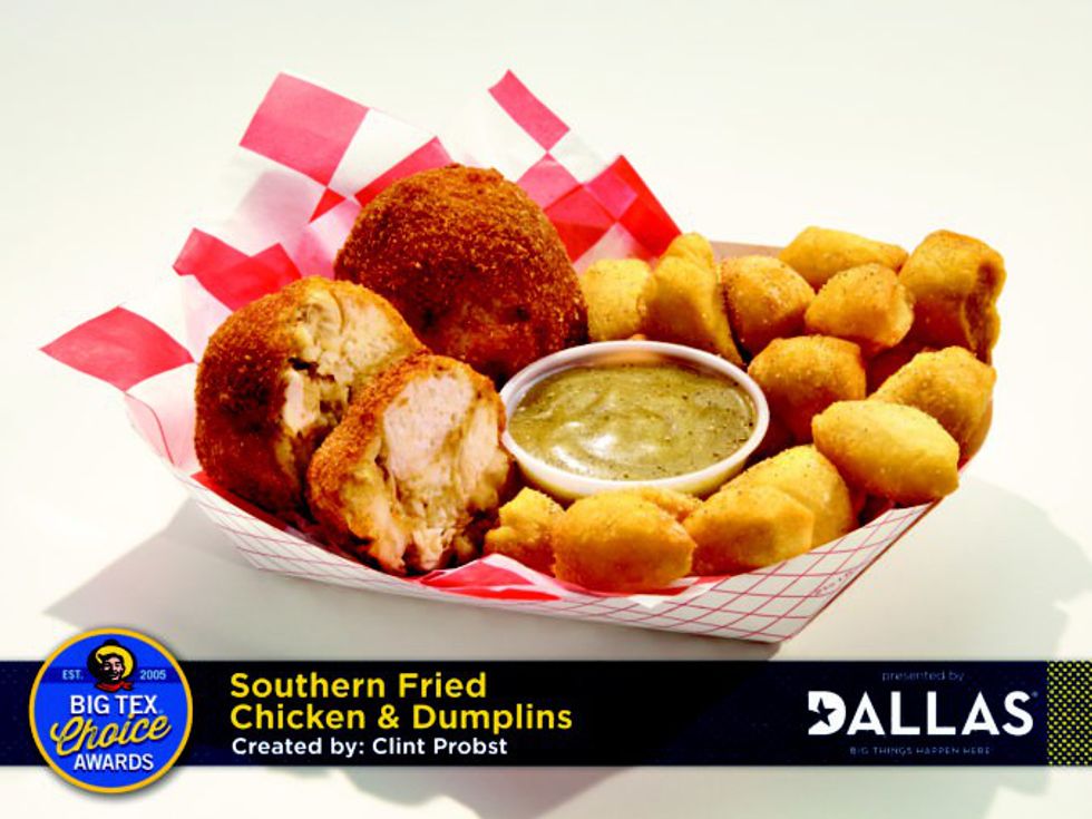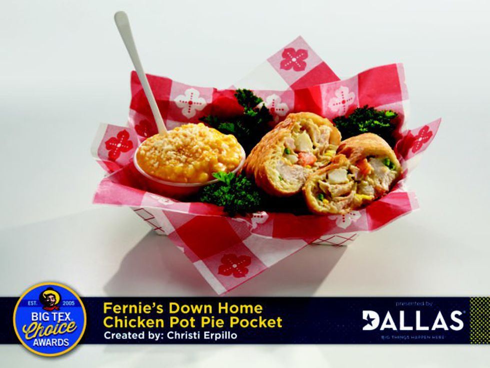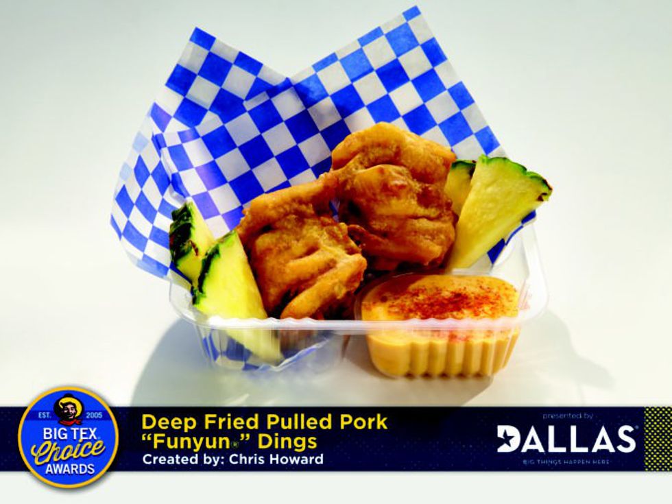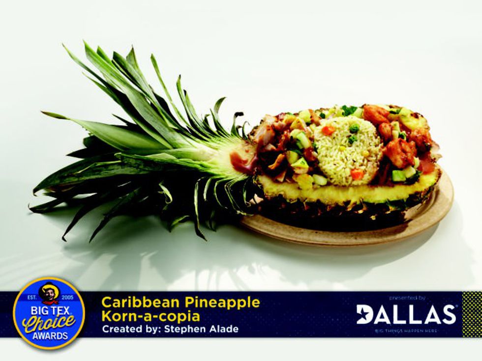 Entries in the Big Tex Choice Awards are almost always fried, but this finalist is surprisingly not. A scooped out pineapple overflowing with marinated grilled chicken, Caribbean fried rice (at least the rice is fried), shrimp, tropical salsa and pineapple rum glaze sounds too good to be true.