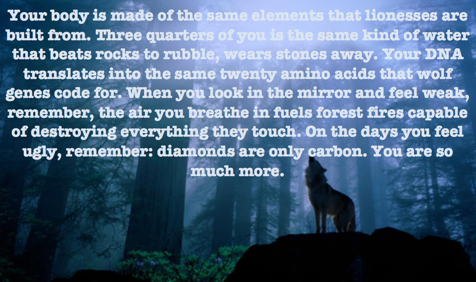 3. Your body is made of the same elements that lionesses are built from. Three quarters of you is the same kind of water that beats rock to rubble, wears stones away. Your DNA translates into the same twenty amino acids that wold genes code for. When you look in the mirror and feel weak, remember, the air you breathe in fuels forest fires capable of destroying everything they touch. On the days you feel ugly, remember: diamonds are only carbon. You are so much more.