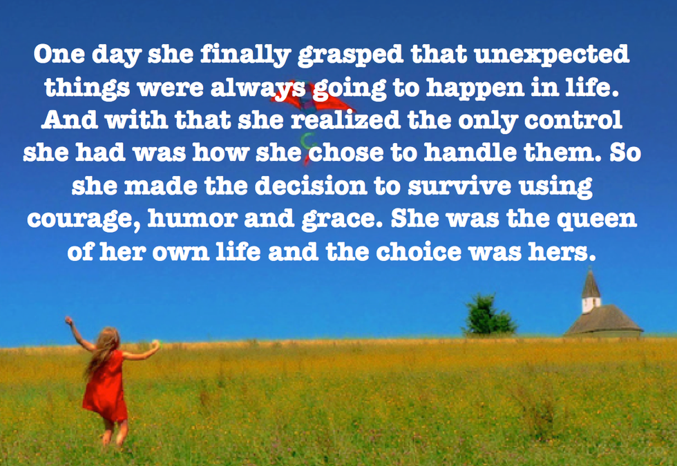8. One day she finally grasped that unexpected things were always going to happen in life. With that she realized the only control she had was how she chose to handle them. So she made the decision to survive using courage, humor and grace. She was the queen of her own life and the choice was hers.