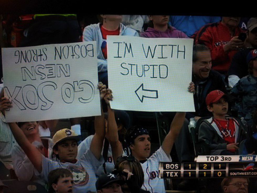 "Hi Dad!" "Go Sox!" and... "I'm with stupid"?