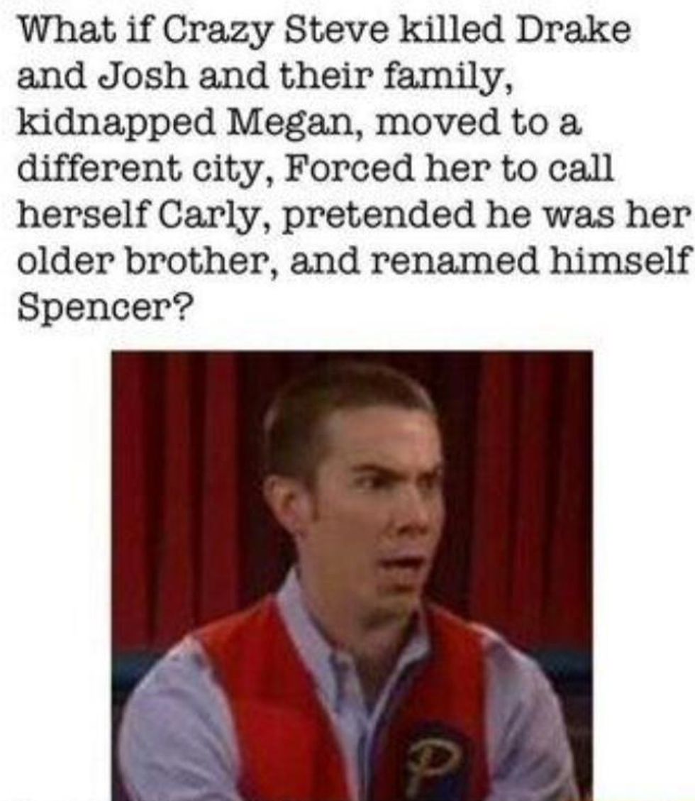 You know how Miranda Cosgrove was Meghan on Drake and Josh, and Jerry Trainor was Crazy Steve on the show as well? Well there is this fan theory that Crazy Steve killed the family and took Meghan captive and brainwashed her into thinking she was Carly and he was Spencer. Crazy, right? But, it is what makes you think.