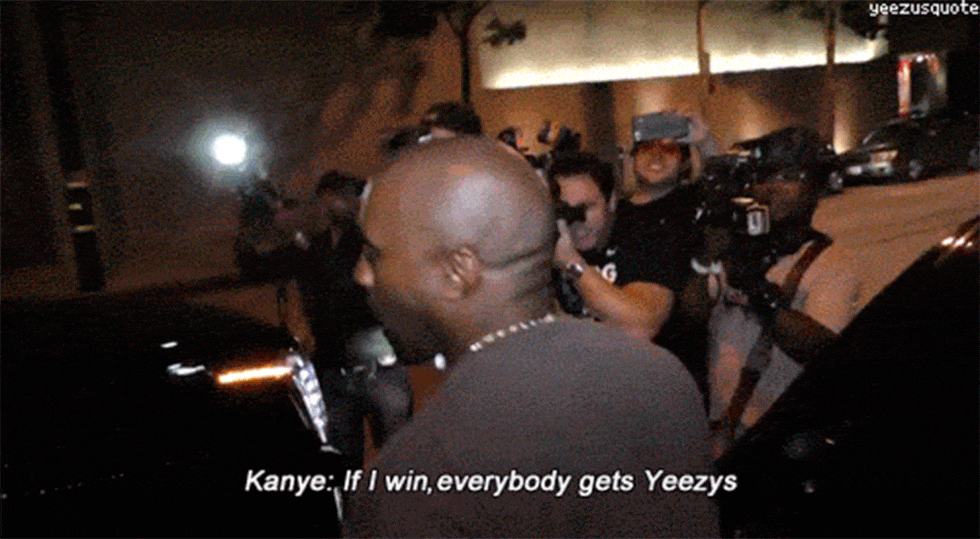OK, let's start off with the fact that Kanye has promised free pairs of Yeezy Boosts to everyone if he is elected president. I mean, that would probably solve any problems with the economy. Actually, it wouldn’t. Stop harassing me, it wouldn’t hurt to get a pair of $2,000 shoes for free.