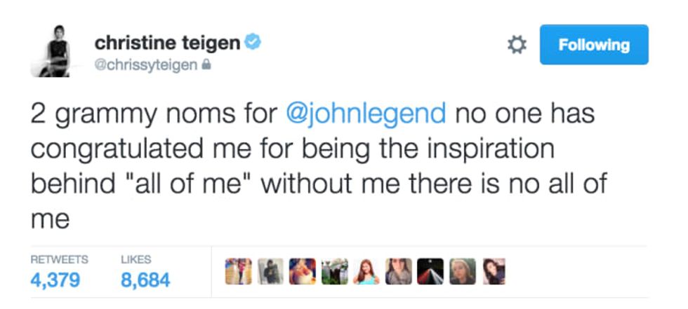 4. I love Chrissy because she says what we have all wanted to say to some of Donald Trumps ridiculous Tweets. She is always trolling Trump and is even accompanied by John Legend which makes it so much more perfect.