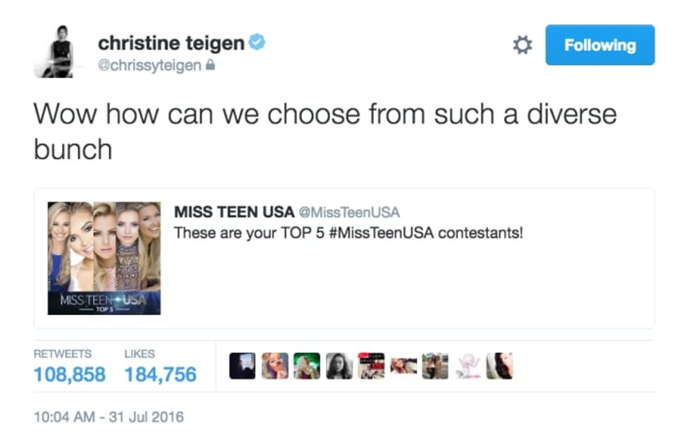 3. I love Chrissy because she is not afraid to point out very real issues. For example, Miss Teen USA had their top 5 contestants and Chrissy noticed that they were all white, blonde haired teens. Obviously, not a coincidence.