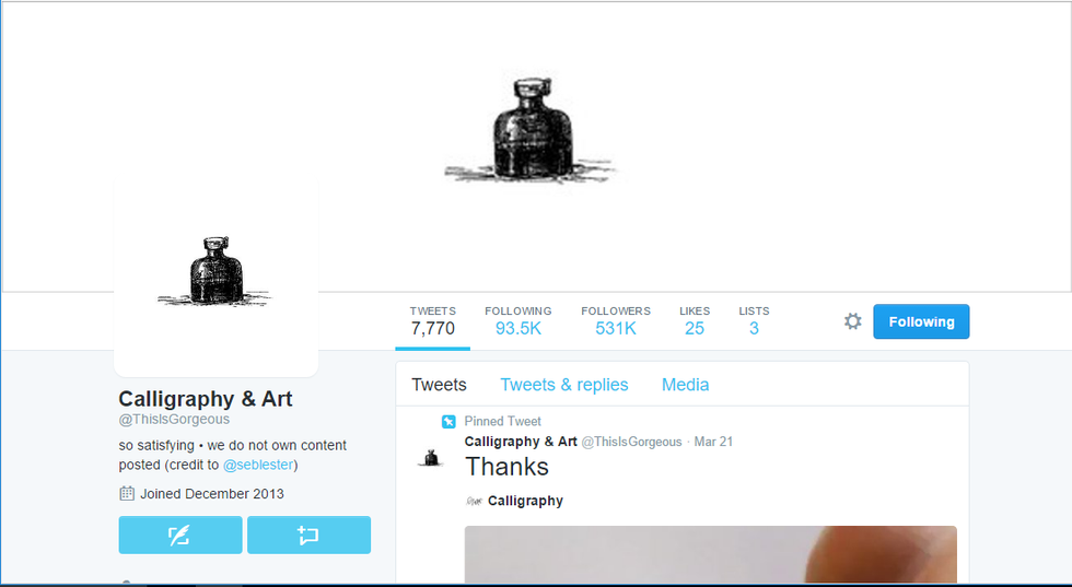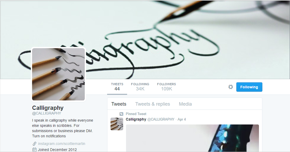 Wow. The calligraphy on this account could make pretty much anyone envious. Not only does this account feature calligraphy, but retweets a lot of satisfying content!