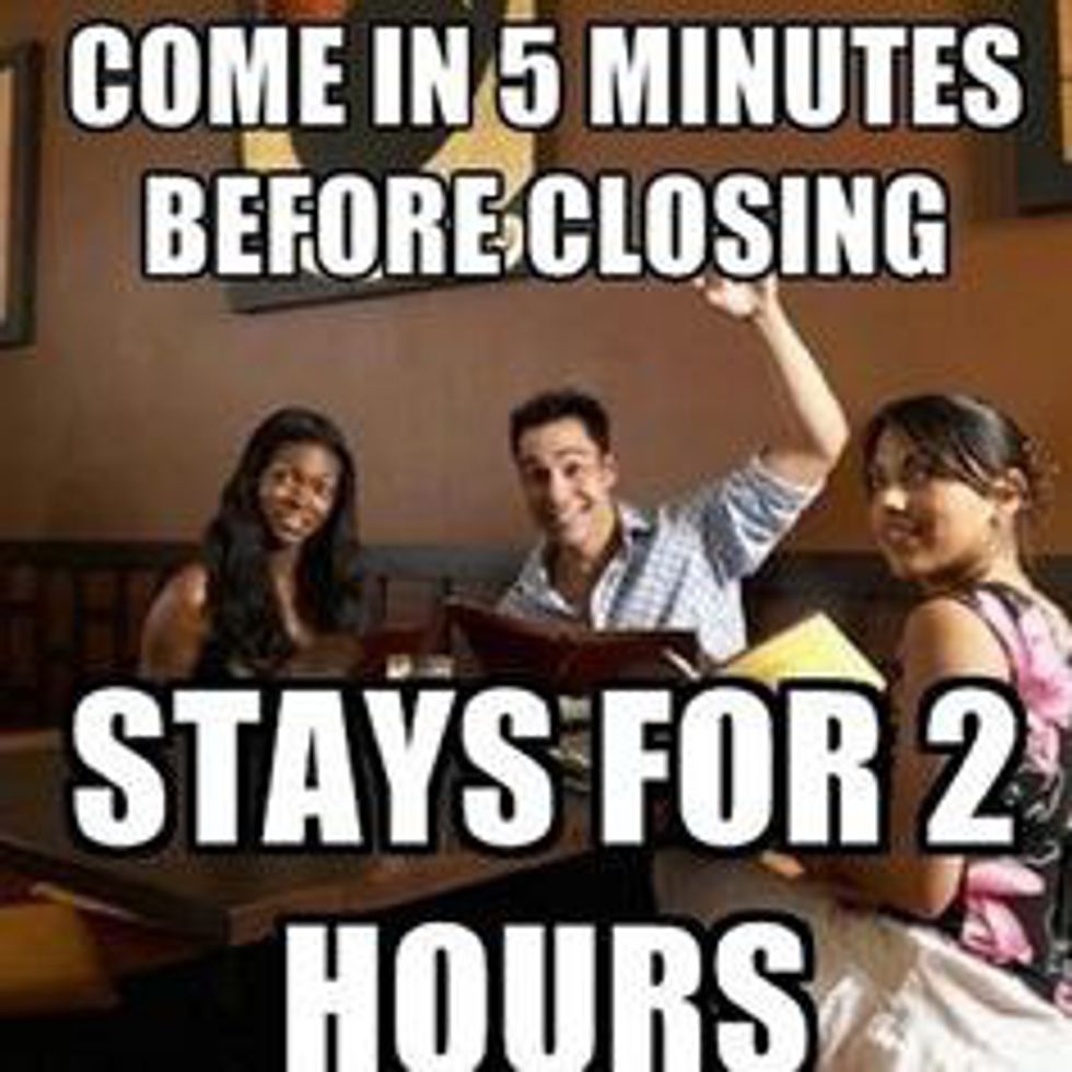 Do not, under any circumstances, show up somewhere five minutes before closing, even if you are hungry or desperate. Thirty minutes earlier may have been pushing it, but five minutes before is unacceptable. No one likes staying longer than necessary for many things in life, and this is one of them. If you really are that hungry, go somewhere else. I say this because the likely hood of you getting a great meal drops extensively the moment you ask, "Are you still open?" Have some respect for these people and find food, or whatever you are looking for, elsewhere. They may not say it, but there is some real negativity inside when someone comes in that close to closing.