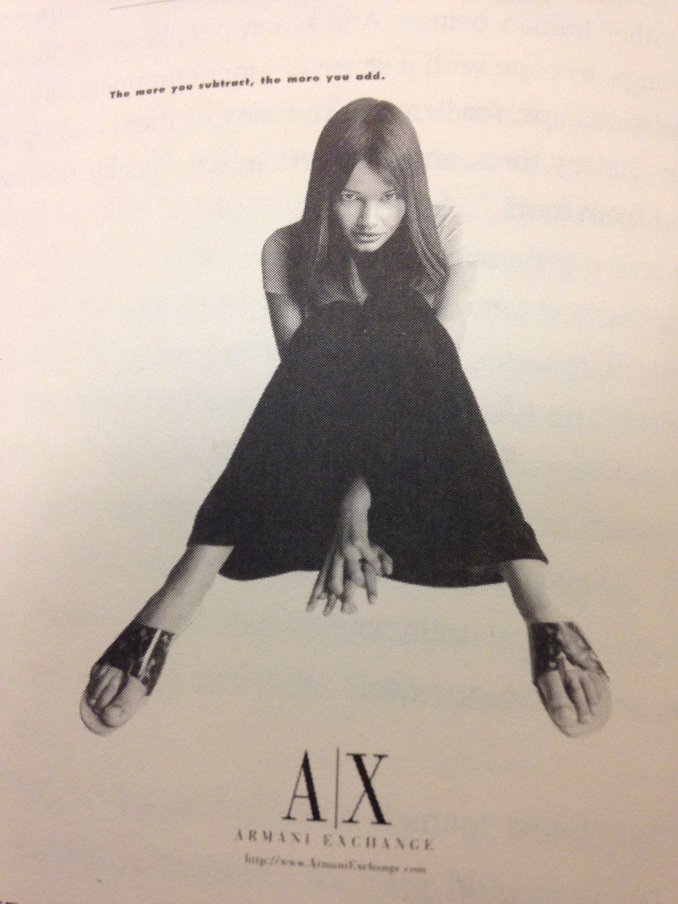 Kilbourne's film also talks about this idea of girls feeling they can't take up space. Activist Melissa A. Fabello mentioned in a podcast the fact that women and girls usually cross their legs, as if they need to shrink. This can also relate to Lily Myer's poem, "Shrinking Women," that our beauty ideals of women being so thin that they are almost disappearing, also an example of our patriarchal society. This advertisement is for clothes, so maybe the idea was referring to fashion, but I think it can relate to weight.