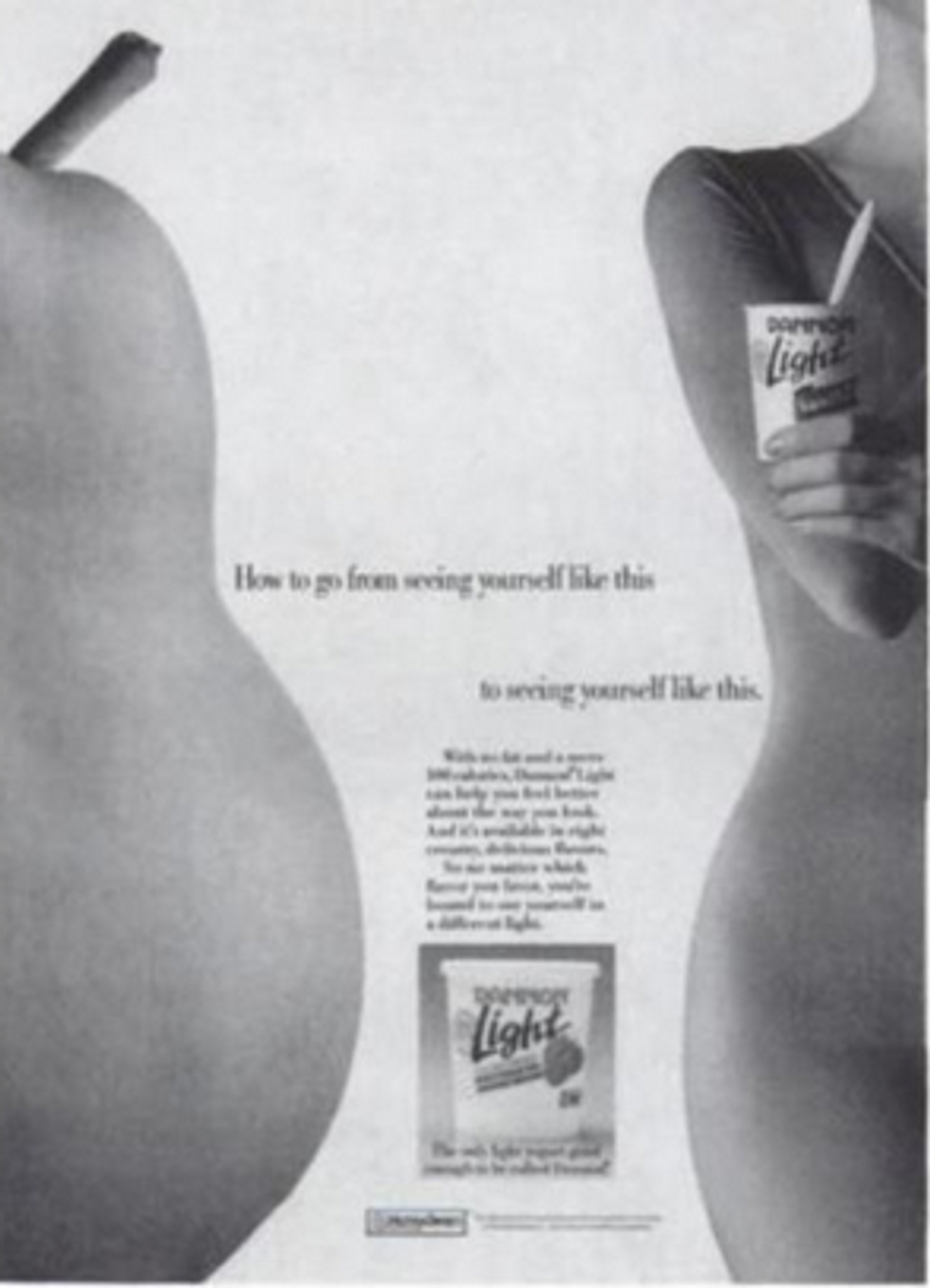 In trying to get a diverse array of advertisements for a recent project, I wanted to find one that represented the queer community. This was found in the 1997 Sport Illustrated swimsuit edition as a three-page advertisement. Basically, from my understanding, the main page was the left side, shaved legs, and then it opened to the other two pages on the right, showing a man. As if that is not enough, the tagline is, "You either have it or you don't." This not only objectifies women down to just legs, but could also represent the trans community. While the tagline is probably talking about the alcohol they're attempting to sell, I think it could also refer to body parts.6. Dannon
