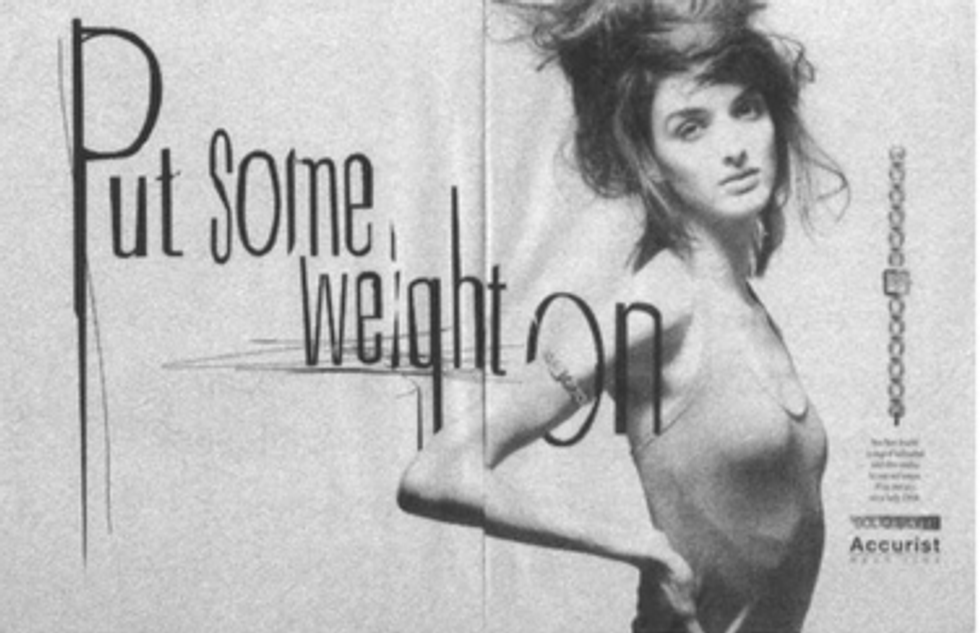 This is a British advertisement, where this extremely thin model wears the watch on her arm. According to the book "Communicating Unreality: Modern Media and the Reconstruction of Reality," the weight was referring to the weight of the watch. The company was ridiculed for choosing a model who appears to be anorexic. The truth is though, this is the size some models aspire to be, and what some agencies might be looking for. Like I said, shrinking women.