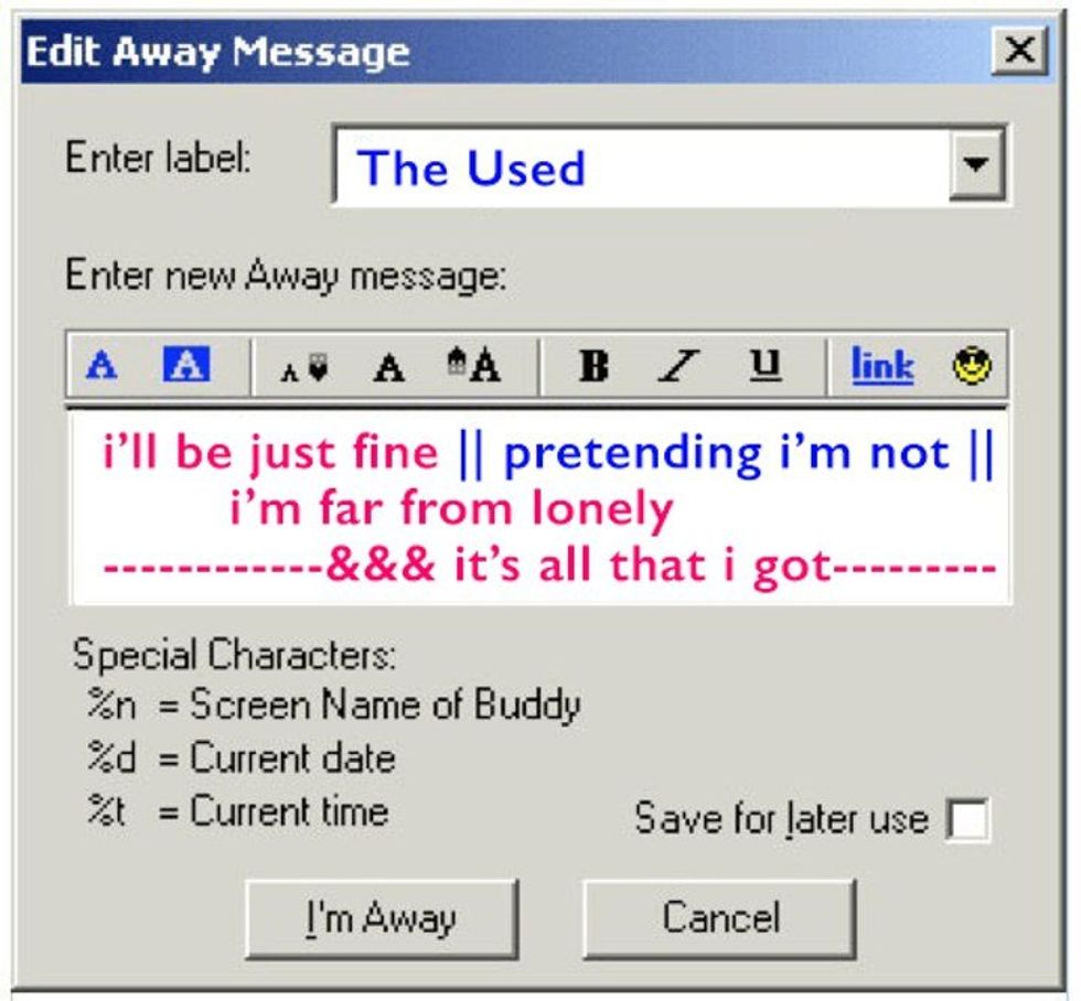 Remember the days of dial-up tones and your mom yelling at you to get off of the computer so that she could make a phone call? When there was no online homework, and the only thing kids used the internet for was chatting on the popular instant messaging service, AIM. With more social networking sites popping up every day, I miss the simplistic days where you only had one site to stalk your crush on and only one away message to read into, instead of countless tweets or status updates. Now, more than ever, people are using song lyrics as popular Instagram captions or tweets, but imagine if these current favorite hits would have been around to be AIM away messages.