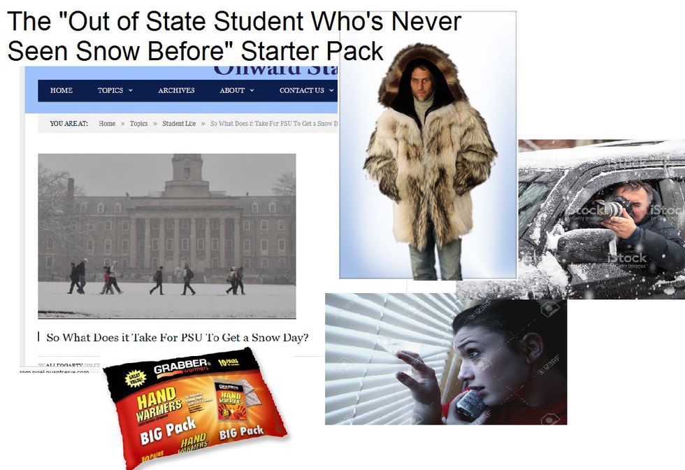 Spring semester at Penn State is a time we can all look forward to. There might not be football games to enjoy on Saturdays, but there's still plenty to do: hockey games, THON, State Patty's Day, Blue/White Weekend, Movin' On. But it's also the time of year that even freshmen start noticing the trends that develop in people here. You look close enough, you'll find a pattern that people start to fit in. There are people who walk too damn slow, the rich kids that all drive a Maserati or a Lamborghini, the people who go out of their way to argue with the Willard Preacher. Here are some starter packs for other groups of people here on campus you may have noticed. Know someone who fits the description pretty well in one of them? Go ahead and bust their chops with these then!
