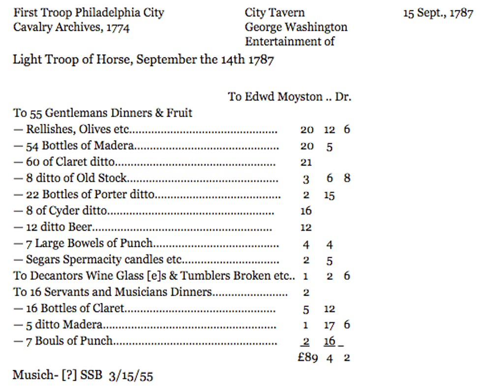 After the Articles of Confederation was a bust, 55 men gathered into the stuffy Pennsylvania State House, where they deliberated the foundation of our nation for three months in the thicket of summer. These men were on major crunch time -- the whole nation was waiting for a document that would bind the self-sufficient states into a federal unit, and they needed nine of the 13 completely different colonies to ratify the document. So, who blames them for letting loose a little bit at the local tavern after all of their hard work paid off? The bill from the tavern (picture below) lists 59 bottles of Madeira and 76 bottles of Claret (both wines) and 42 bottles of various kinds of beers, not to mention the part of the bill that lists the reimbursement for the 'Wine Glass[es] and Tumblers Broken.' The total price of this huge party was roughly $7,402.04 in modern USD. What I personally learned from this discovery: George Washington really knew how to party once he let down his powdered hair.