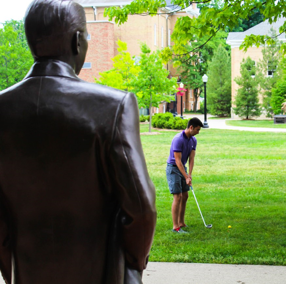 Statue golf, like many college activities, originated out of boredom. Nevertheless, its simple premise of hitting a foam ball from statue to statue with as few strokes possible, quickly became, as the Student Activities Board (SAB) states, "one of the most iconic traditions at Hillsdale College." Luckily, as if nine holes (statues) of golfing was not enough, SAB also claims that, "Plans to expand the current nine hole course into a full eighteen are in the works."
