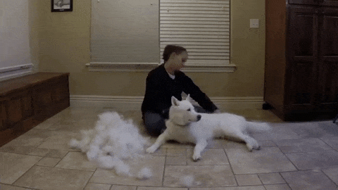 No, I don’t mean they just blow their coats a few times a year and it’s a little bad. I mean they literally have balls of hair fall off all year around. Everything you love will be covered with dog hair. You will put on clothes in the store and BOOM-it has husky hair on it. I opened my Physics binder in lecture the other morning and a clump of husky hair was stuck in the clasps. It balls up under the furniture, coats anything made of fabric, and clogs up your dryer’s lint trap.