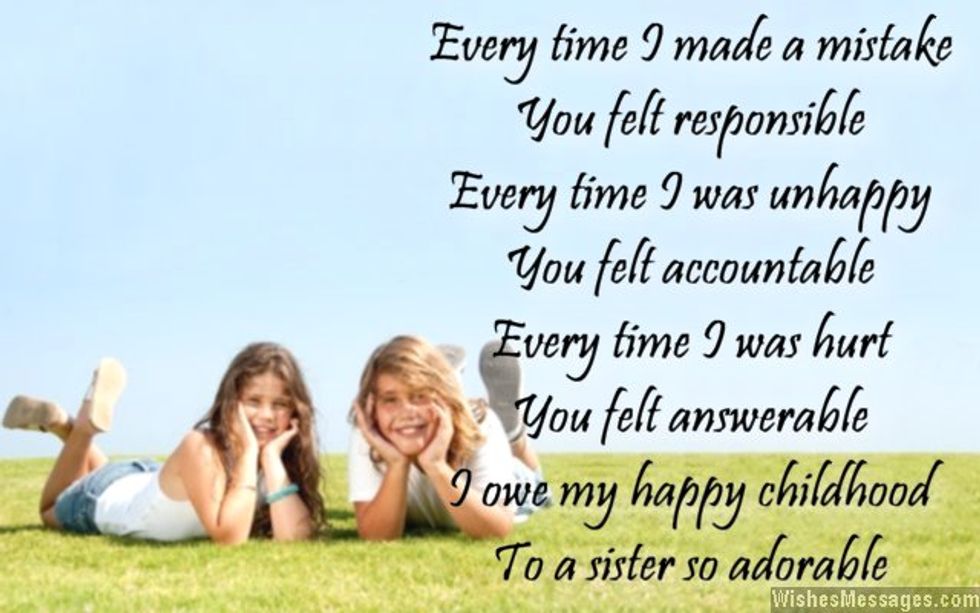 There's a bunch of great things about having an older sibling, especially an older sister. She's got some special qualities. As one of the fellow family members, she loves the family, she'll agree to do certain things with you and for you, whether it's watching a movie, going out to watch the comedian, and she'll be a role model for you. She'll enjoy the fun times with you as well. You see how things should be done by the way you see her conduct herself.