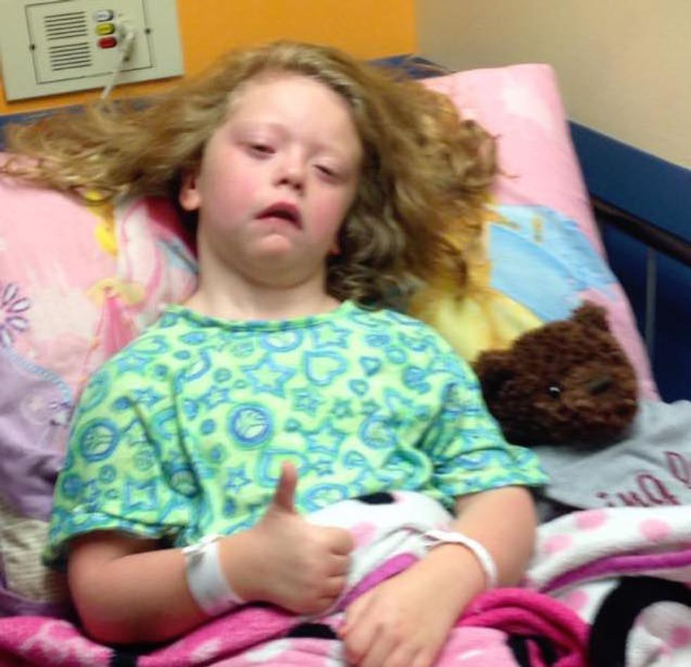 Because of a missing elastin gene, Lauryn's aortic artery was narrowed, resulting in the need for open heart surgery. She remained optimistic though, as shown by her thumbs up.