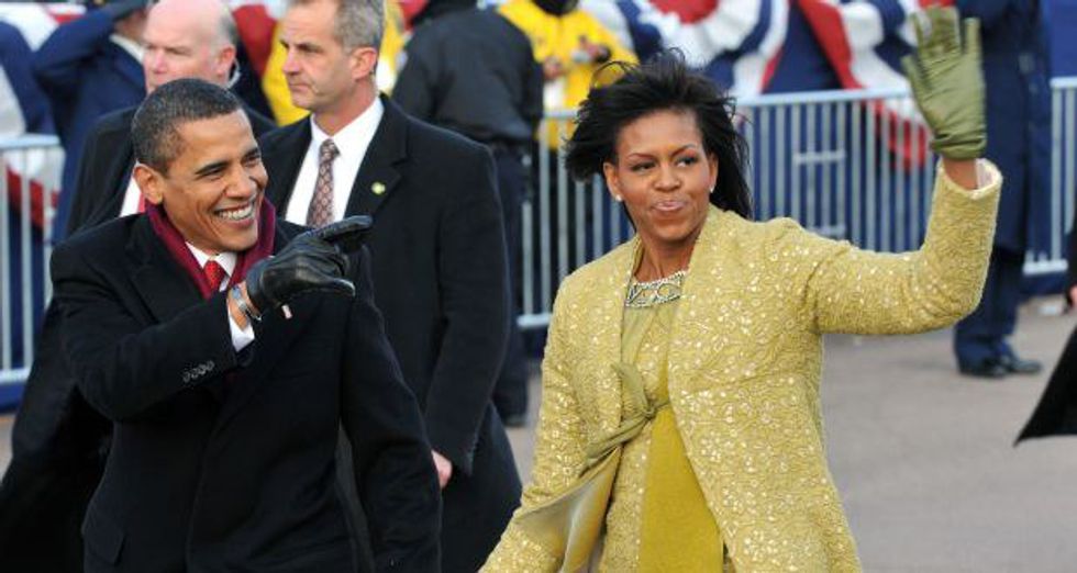 Despite the cold, windy morning in Washington, D.C., Michelle donned a gold dress with a sparkly gold jacket. Designer Isabel Toledo knew what she was doing.