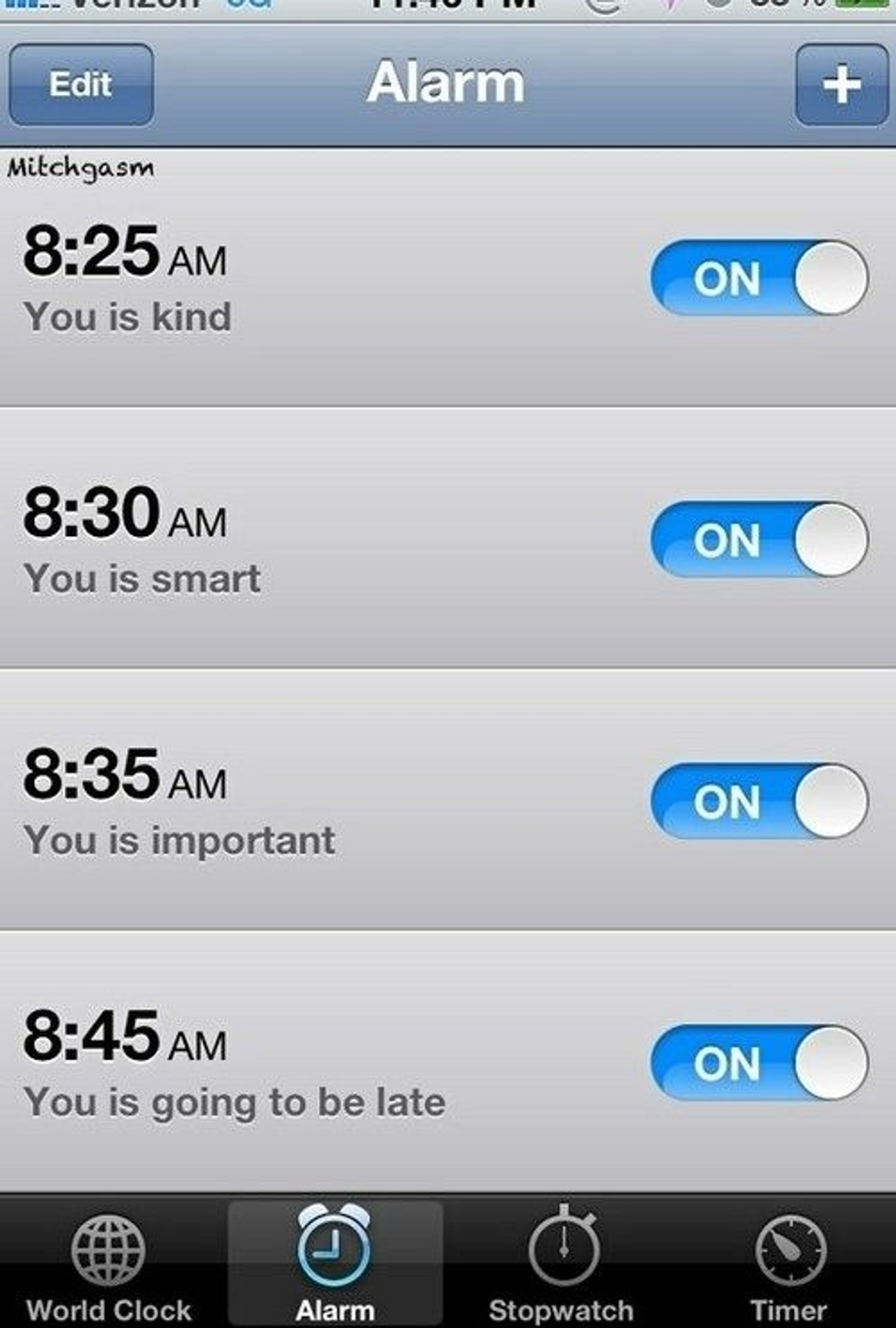 You can set up your alarms so that they’re staggered and go off at different times, but if you have many anyways, use them. Set up your alarms so that more than one (although I recommend only two, maybe three, at the most) goes off at the same time. This will not only double (or triple) the sound, but if both alarms are some of the more effective/annoying (depends on how you look at it) ones like those mentioned above, then you’ll have to complete double the number of creative tasks in order to stop the noise, meaning that you’re awake for longer, which increases your chance of waking up.
