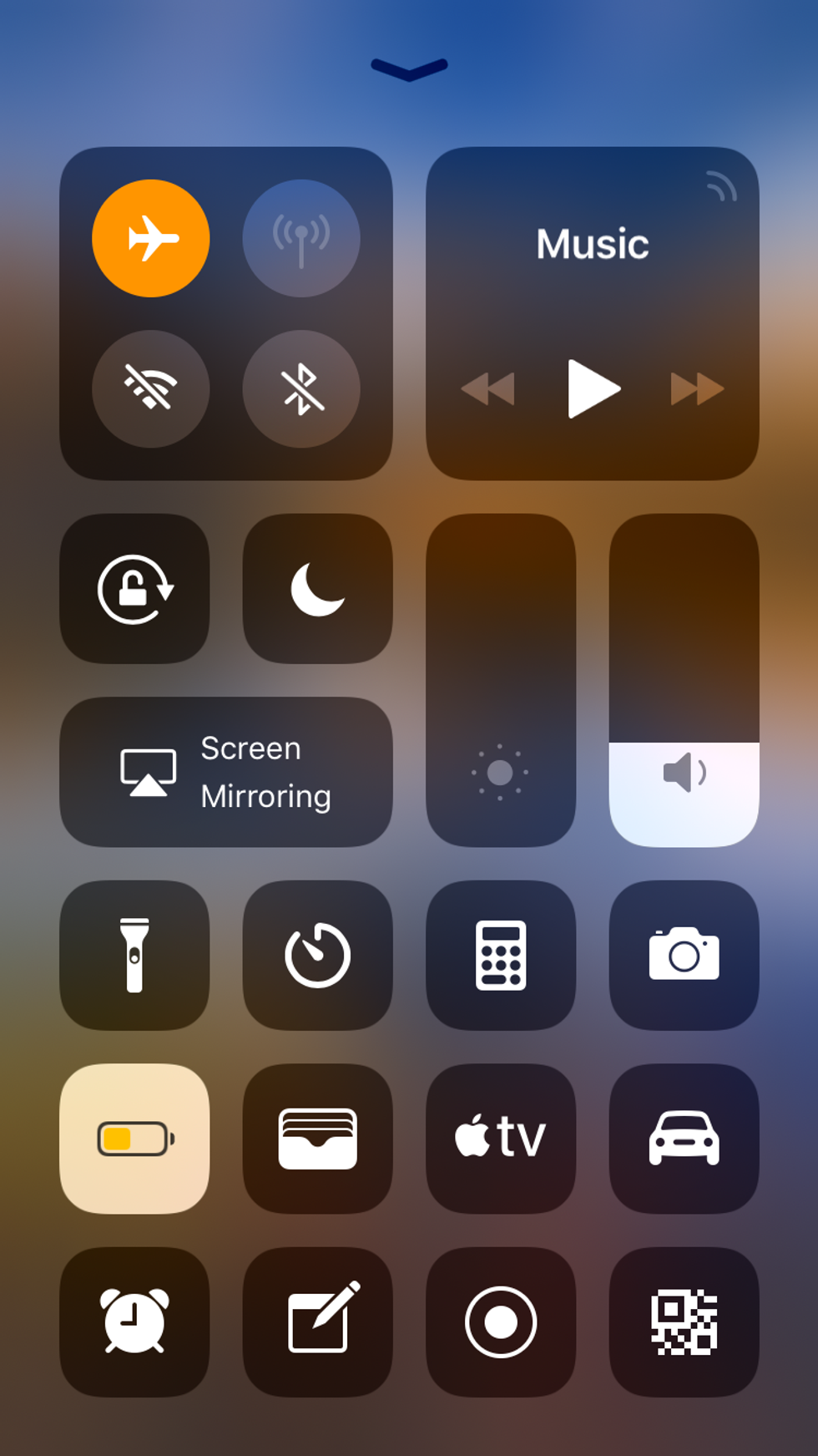 The last tip, keeping your phone on low power mode, is also useful when going in the other direction: charging. By using low power mode, airplane mode, and low brightness, you decrease your battery consumption by as much as possible to ensure that you are able to charge your phone at the fastest speed without turning it off. Seen above is my setup in control center for easily enabling these options.