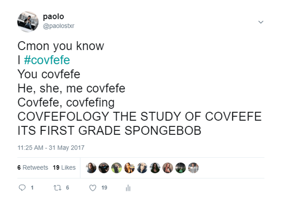 This is my all time favorite "Trumpism." It is the cream of the crop of words on this list in my opinion. I have so much love for this word, and it's not even a word. This word is special to me because Donald Trump tweeted it on my birthday. That's right. On May 31, 2017 at 12:06am, the president tweeted a gift. It felt like it was just for me. It's as if the president knew it was my special day, and he wanted it to be particularly special. Twitter exploded, trying to figure out what the word means. I'm sure the word was supposed to be "coverage," but instead "covfefe" was born. The theatre of it all is quite beautiful, actually. No matter where one lies on the political spectrum, "covfefe" will always be an enigma. Oh! and the jokes. The beautiful jokes and memes. They are absolute treasures. My favorite ones are where people pretend covfefe is some weird form of coffee. "Yes, hello sir I'll take one covfefe please." Beautiful. I even tried to join in on the fun by tweeting my own version of the meme.
