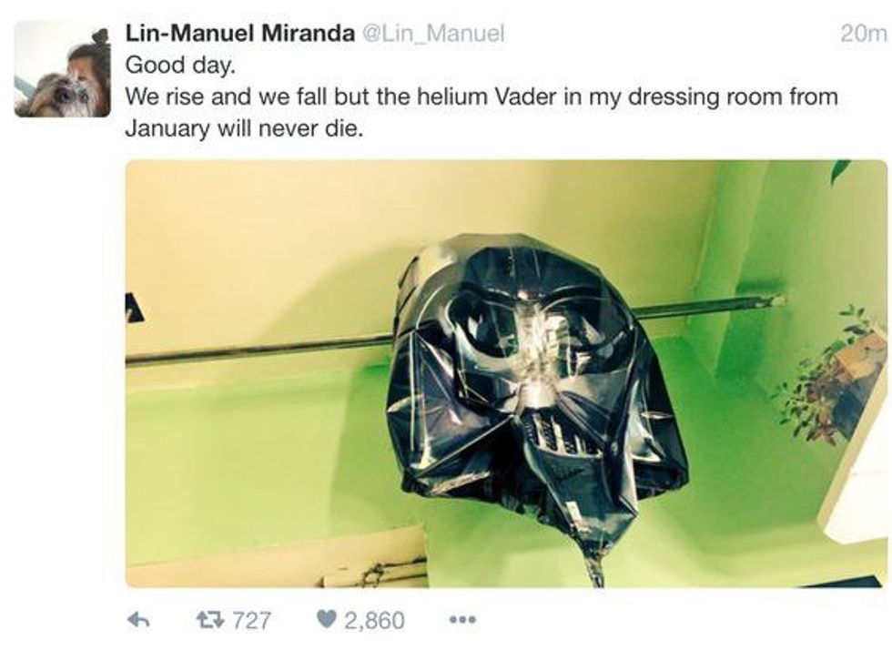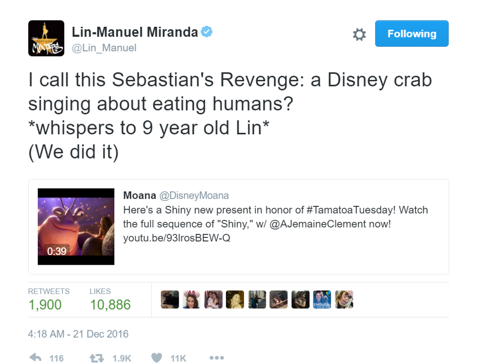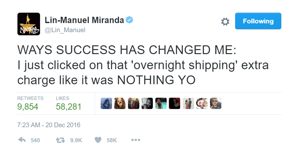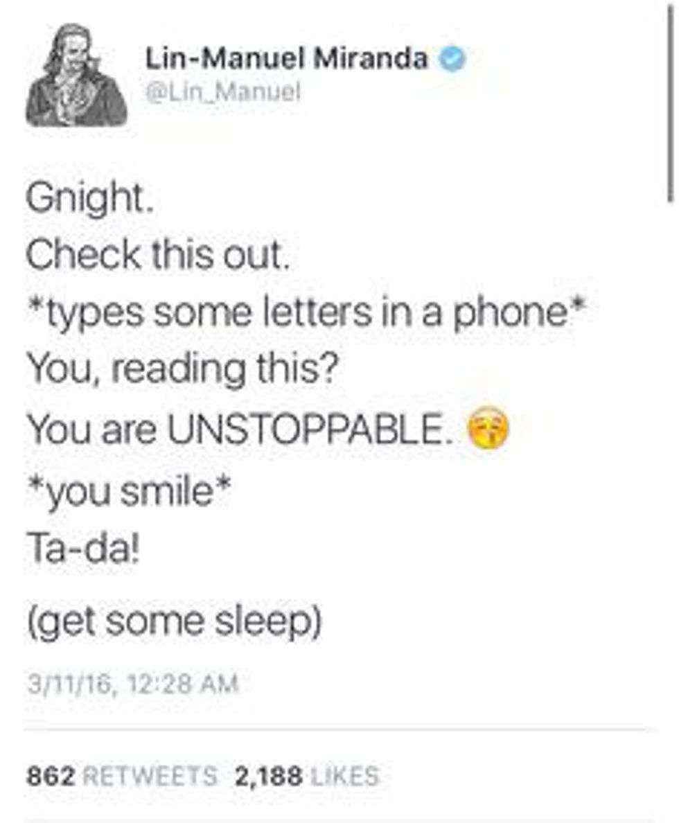 Lin-Manuel Miranda has the best twitter account you can follow. If you don't know Lin, he is the creator of the Broadway hit musical Hamilton, and he also wrote the songs in the new Disney movie Moana. This man is a shining ball of happiness, and his tweets always help me out on a bad day. Here is a collection of my personal favorites of his tweets.