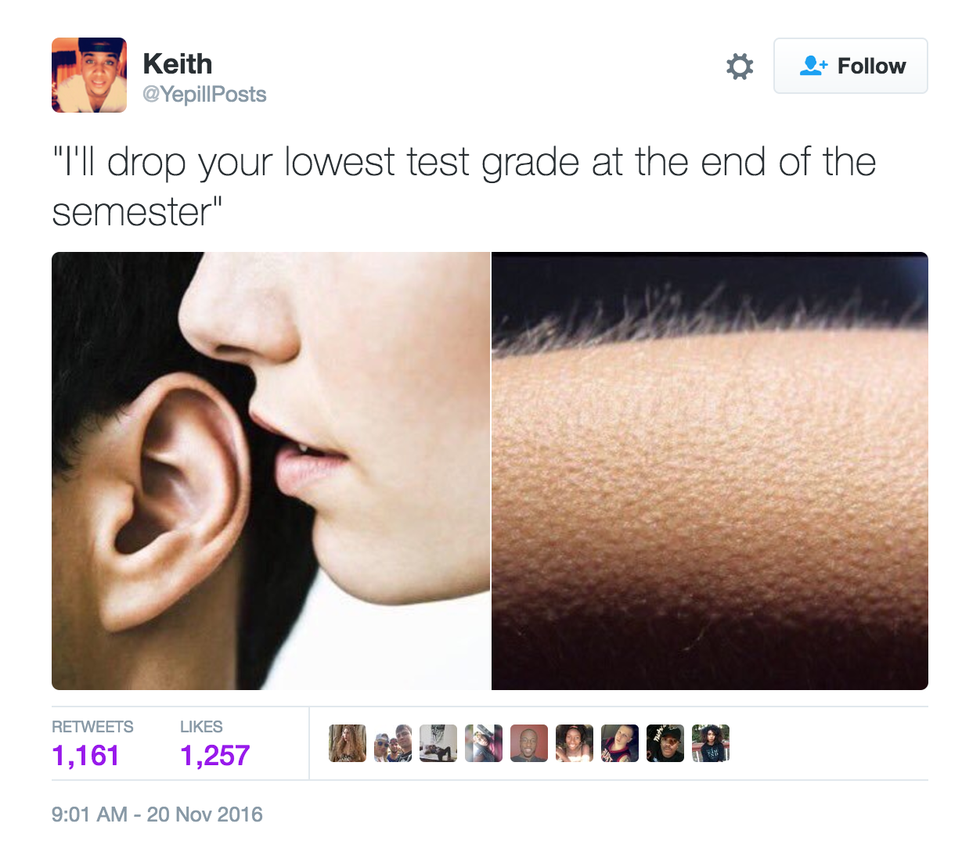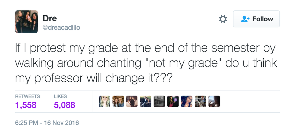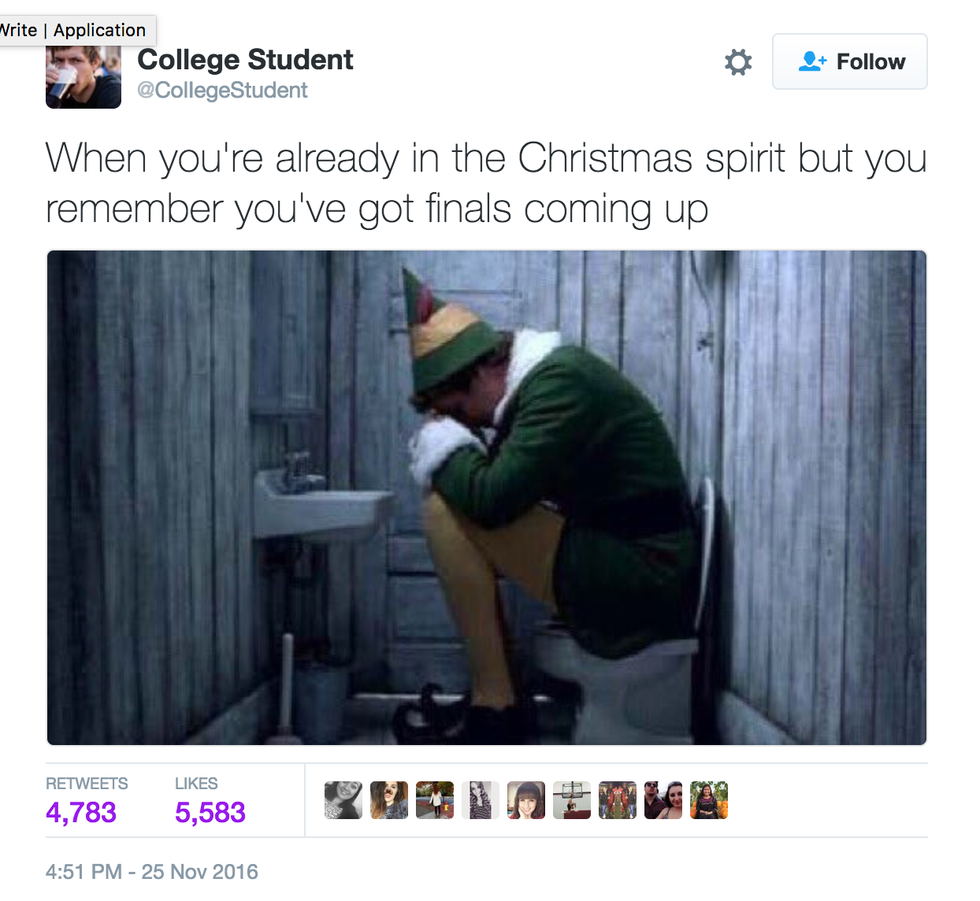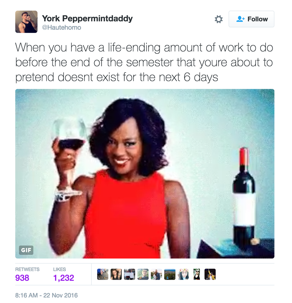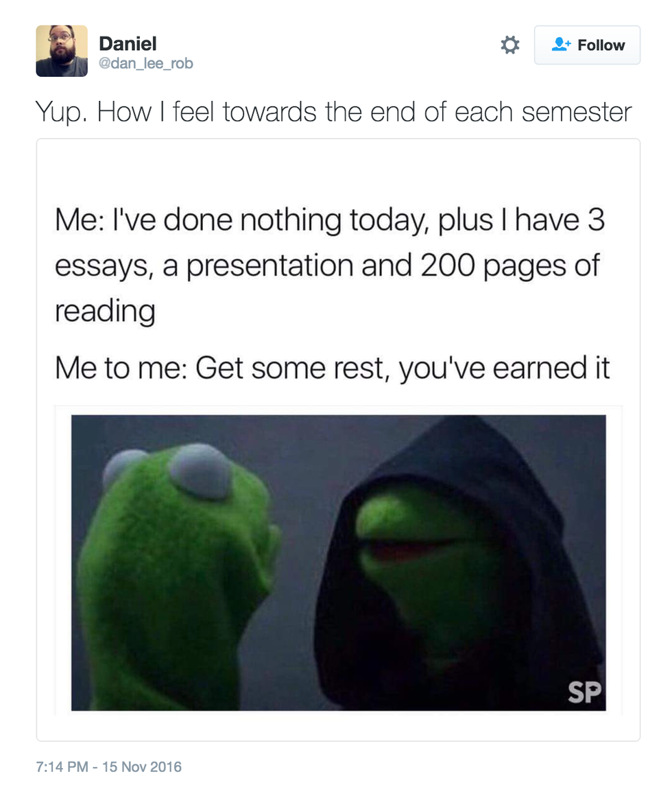 Ah, Twitter. The best way to procrastinate. At least we're all in this together. Don't worry, the semester will be over soon enough. Feel free to take plenty of study breaks on Twitter and know even if you failed, you still tried. You got this.