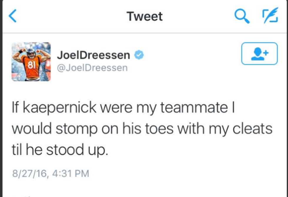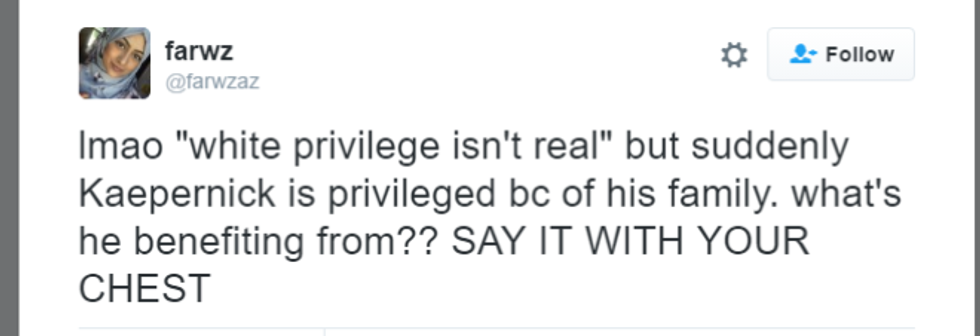 Privileged people have been trying to take away from Kaepernick's protest by using his parents reaction against him. Critics of his actions have also tried to erase his racial/ethnic identity. This twitter user was fed up