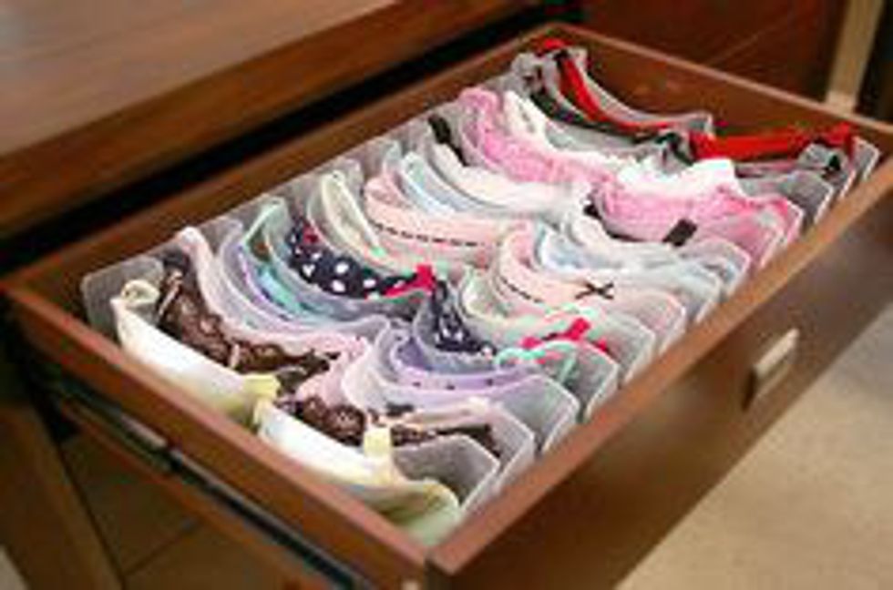 Bras are more likely to keep their shape and last longer if you just sit them in a dresser drawer exactly how they are made. Doing this also allows you to stack them together more easily saving room overall.