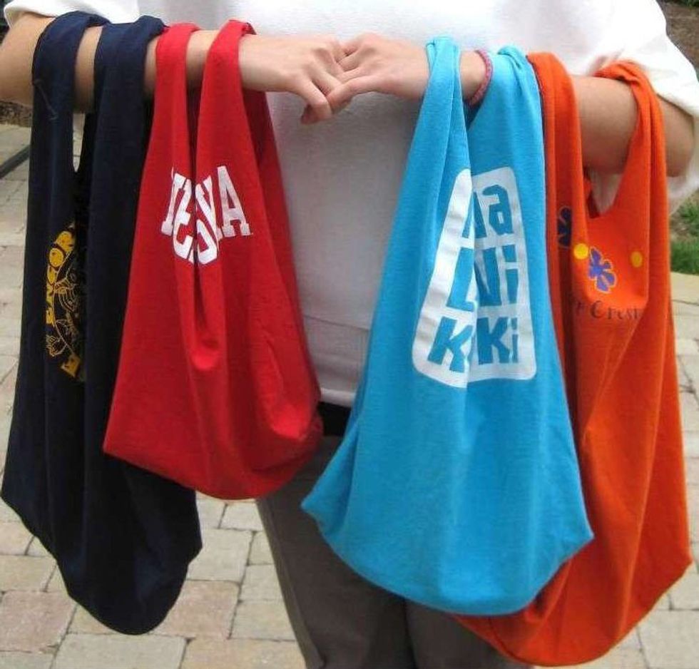 Although this one may be a bit more difficult and time consuming than the no-sew bag, it is still cool. Make this if you have quite a few stained T-shirts, or if your roommate is trying to get rid of some clothes you can make this instead of throwing the shirts away..