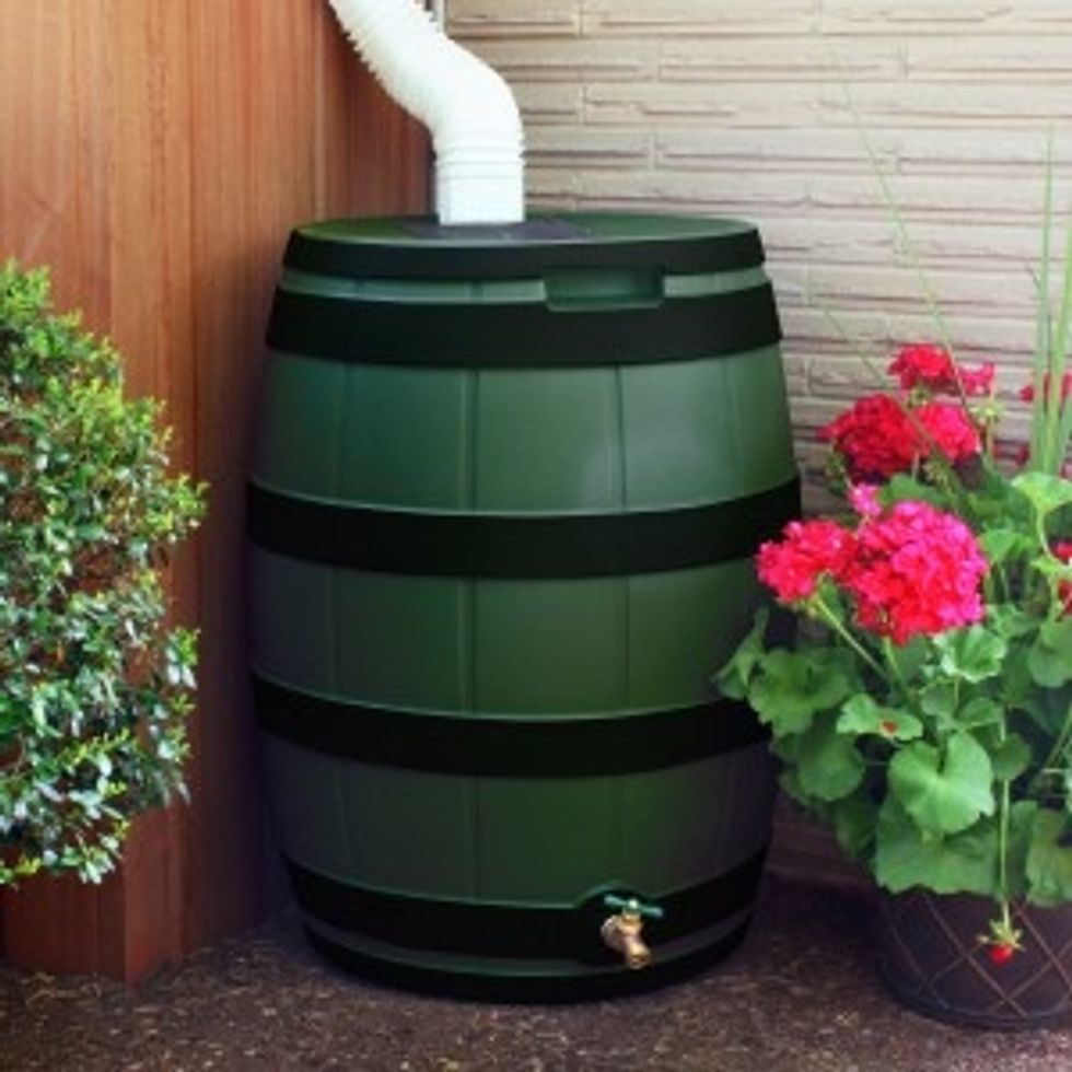 Placing a rain barrel in your backyard will collect rain water which you can use to water your plants and grass.