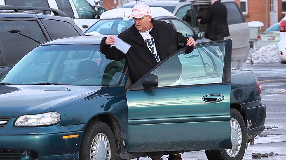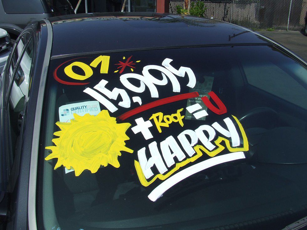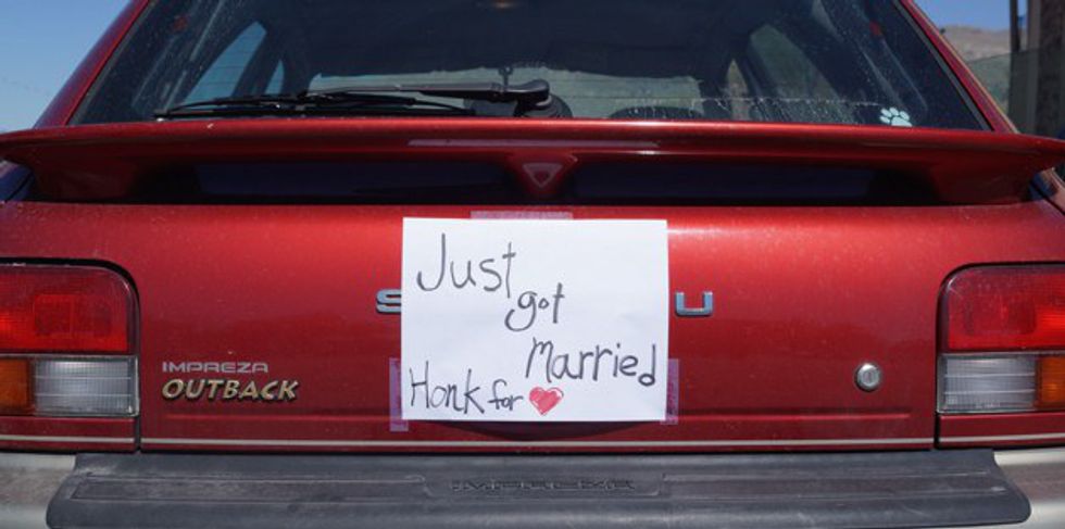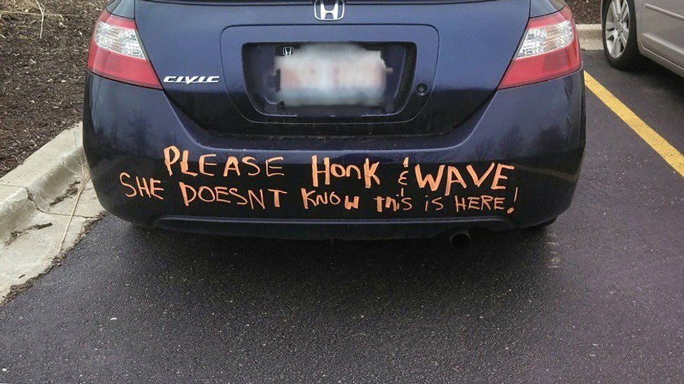 Make sure that he's backed his car into a spot, garage, or wherever he's parked. If not, say you need to borrow his car and then do it for him. The rest is a piece of cake. Make the sign as creative as you'd like. It has to say "HONK" for a congrats, for love, or something along those lines. For extra points, add some tin cans attached to string.2. "Sorry for the damage"