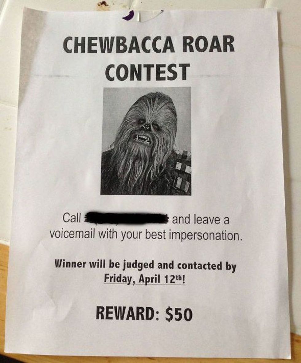 Place this sign around town in the morning at places that are sure to gather some contestants. For example, a bar, behind a bathroom stall door, or even under people's windshield wipers. Soon enough the picture of the Chewbacca contest will hit Twitter and Snapchat. He'll be going crazy by the end of the day trying to figure out why he's getting loud moans and groans in his mailbox.